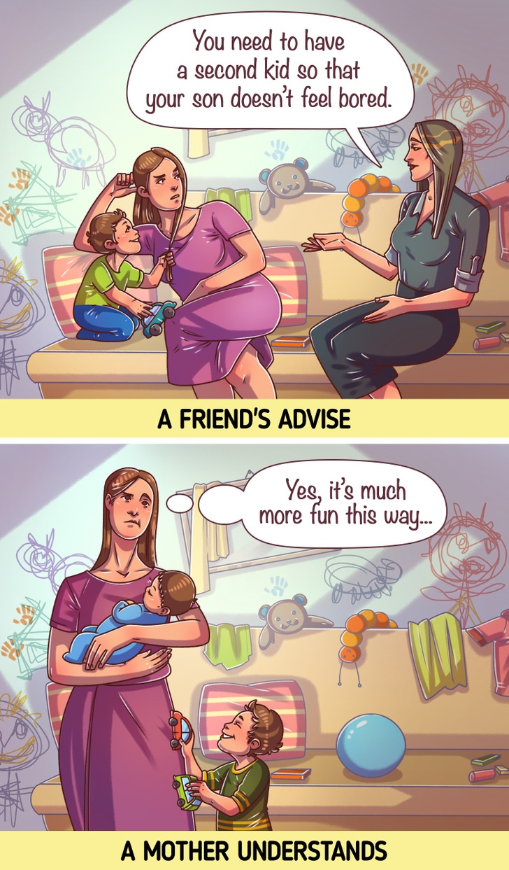 Đối với người ngoài, họ thường biết rõ hơn về những gì cha mẹ trẻ nên làm. Bạn bè và hàng xóm có thể dễ dàng nói những câu như “Đã đến lúc sinh con thứ hai rồi” hoặc cho rằng một người mẹ và người cha nhất thiết phải sinh con trai hoặc con gái, hoặc nghĩ rằng đứa trẻ sẽ thiếu sự quan tâm khi đứa em nhỏ được sinh ra. Tất nhiên, ít người vội vàng làm theo lời khuyên này, nhưng họ thực sự cảm thấy khó chịu với nó.
