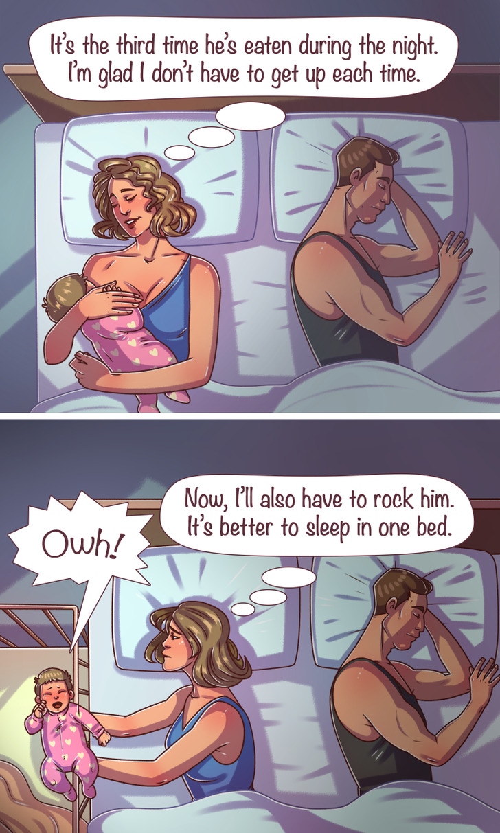 Nhiều người thông thái khuyên các bậc cha mẹ trẻ không nên để con ngủ chung giường, thay vào đó, nên đặt con vào cũi ngay từ khi mới sinh. Một số người thực sự cảm thấy thoải mái hơn theo cách này và điều đó thật tuyệt vời. Trong khi đối với các bà mẹ khác, không phải thức dậy 5-7 lần mỗi đêm để dỗ con và cho con bú, thì việc có con ngay bên cạnh sẽ dễ dàng hơn. Và không có gì đáng sợ về điều này. Sự thoải mái của cha mẹ và có được giấc ngủ yên bình mới là điều thực sự quan trọng.