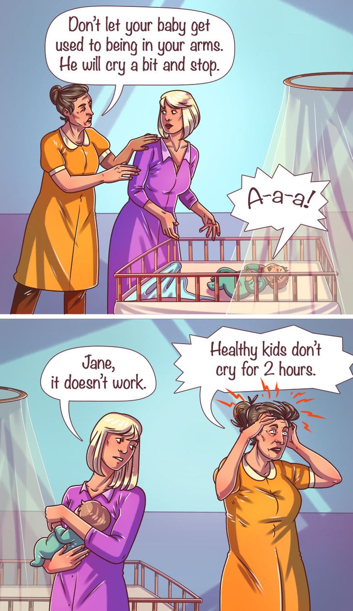 Đứa trẻ khóc trong nôi và đòi được ôm trong vòng tay của mẹ không chỉ vì chúng đang cố gắng điều khiển người lớn. Hành vi đó chỉ là cách duy nhất để thông báo với thế giới về nhu cầu của chúng và yêu cầu sự giúp đỡ. Làm ngơ đứa trẻ với lý do “không để chúng quen với việc nằm trong vòng tay của mẹ” là một điều khá kỳ quặc, nhưng nhiều người vẫn làm theo.