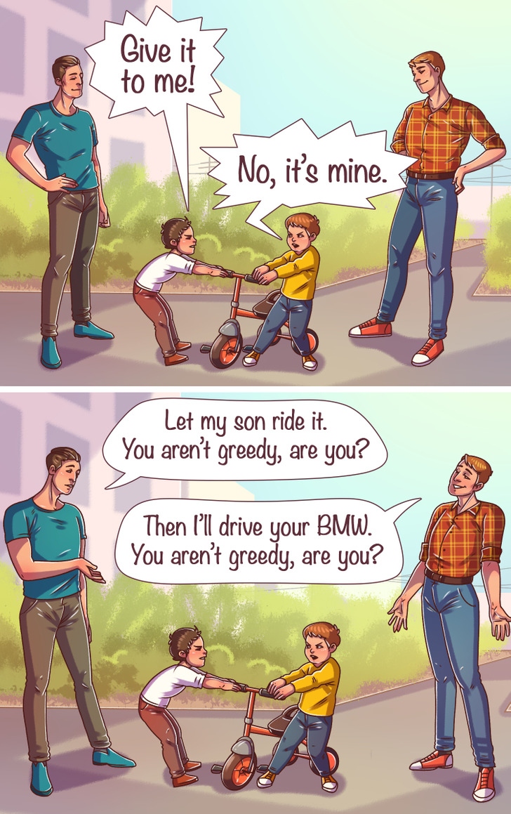 Người lớn thường yêu cầu trẻ chia sẻ đồ chơi của chúng với các bạn mà không hề nghĩ rằng điều đó đang phá vỡ ranh giới của đứa trẻ. Đồng thời, cha mẹ và ông bà cũng đừng vội chia sẻ những vật có giá trị của mình với người đầu tiên họ gặp để không bị coi là người tham lam. Nếu một món đồ thuộc về đứa trẻ và chúng không muốn chia sẻ nó, đó là quyền của chúng.