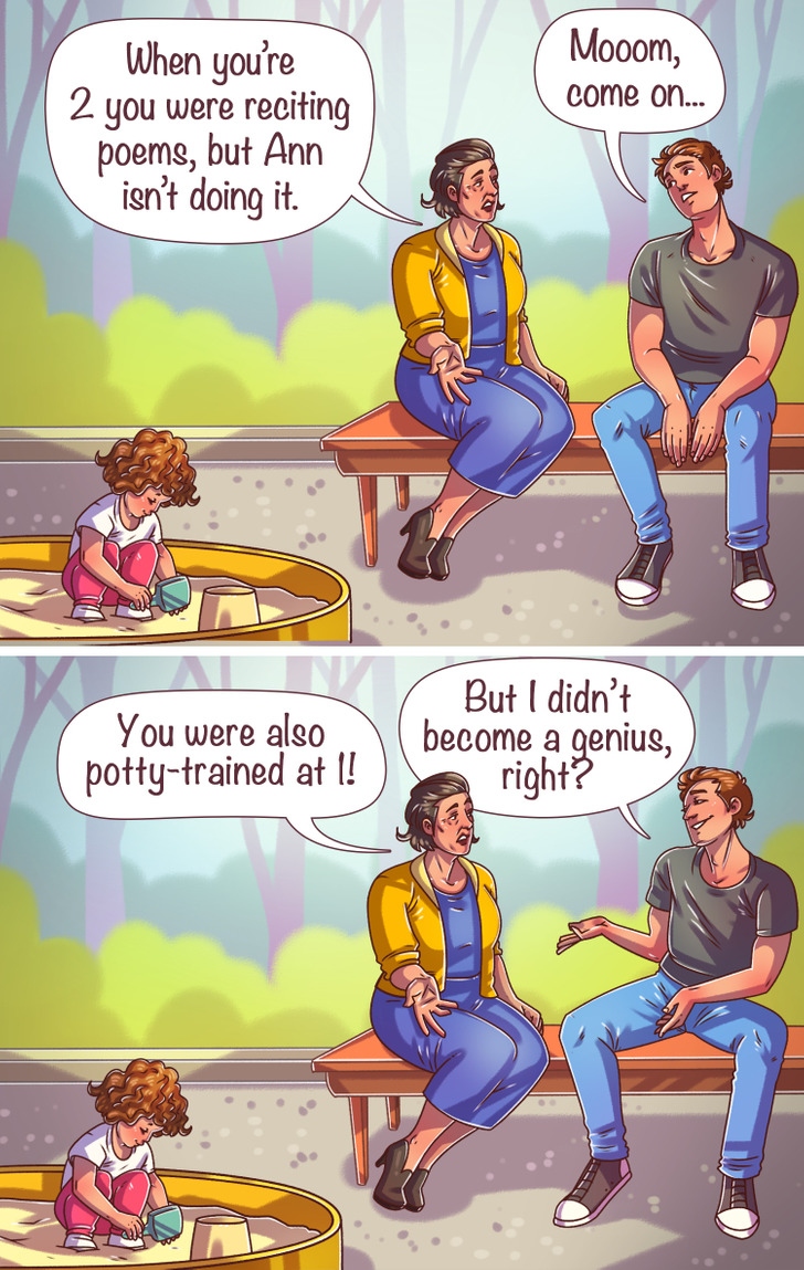 So sánh một đứa trẻ với bất kỳ ai, ngay cả khi đó là cha mẹ của chúng ở cùng độ tuổi, đó không phải là một ý kiến hay. Mỗi đứa trẻ phát triển theo tốc độ riêng của chúng, và chúng chắc chắn không cần phải đạt được một số kỹ năng nhất định ở một độ tuổi nhất định. Việc tập ngồi bô sớm không bao giờ giúp bất cứ đứa trẻ nào trở thành thiên tài, đó là lý do tại sao không cần thiết phải ép buộc lên trẻ em và làm các ông bố bà mẹ phải buồn lòng với những nhận xét như vậy./.