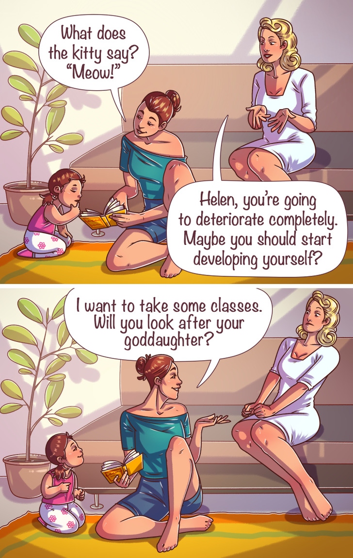 Nhiều người chưa bao giờ nghỉ thai sản cho rằng, các bà mẹ trẻ có nhiều thời gian rảnh rỗi và họ không biết cách dành thời gian đó để giúp sự nghiệp của mình được tốt hơn. Trên thực tế, không phải lúc nào họ cũng có thể tìm được thời gian uống một tách trà trong yên bình với đầy những đêm mất ngủ, đau bụng và đau răng. Thật tiếc khi những người thông thái đưa ra lời khuyên về cách phát triển bản thân trong thời gian nghỉ sinh thường chỉ muốn giúp đỡ bằng lời nói, trong khi việc giúp đỡ một bà mẹ trẻ không còn là trách nhiệm của họ.