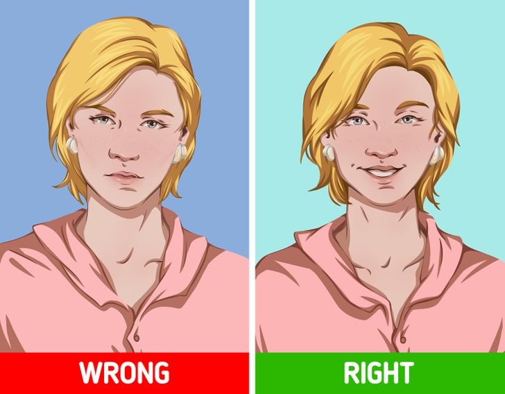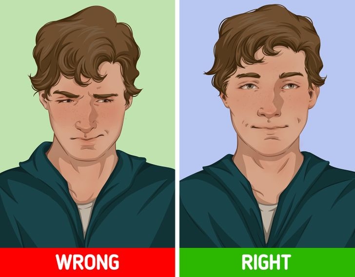 Nếu bạn muốn thể hiện sự tự tin, thì tư thế của bạn phải thẳng và trông bạn cũng phải thoải mái. Bạn có thể làm điều đó bằng cách đưa vai ra sau và ngẩng cao đầu. Bằng cách này, bạn sẽ trông thanh thản nhưng đồng thời cũng tự tin. Một tư thế khom lưng, căng thẳng, với vai hướng về phía trước và đầu cúi xuống, mang lại ấn tượng ngược lại: bất an, nhút nhát và lo lắng.