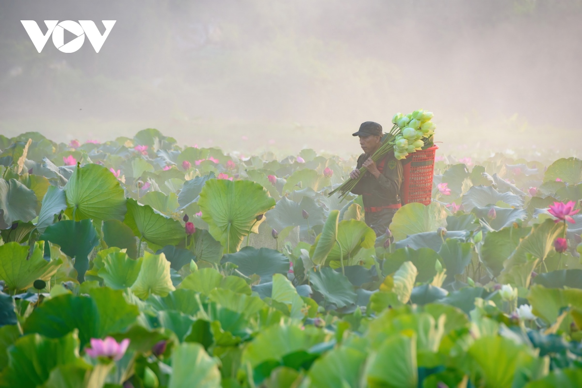 Khi bình minh vừa lên là thời điểm hoa sen nở bung hoà quyện vào màn sương sớm tạo nên khung cảnh huyền ảo.