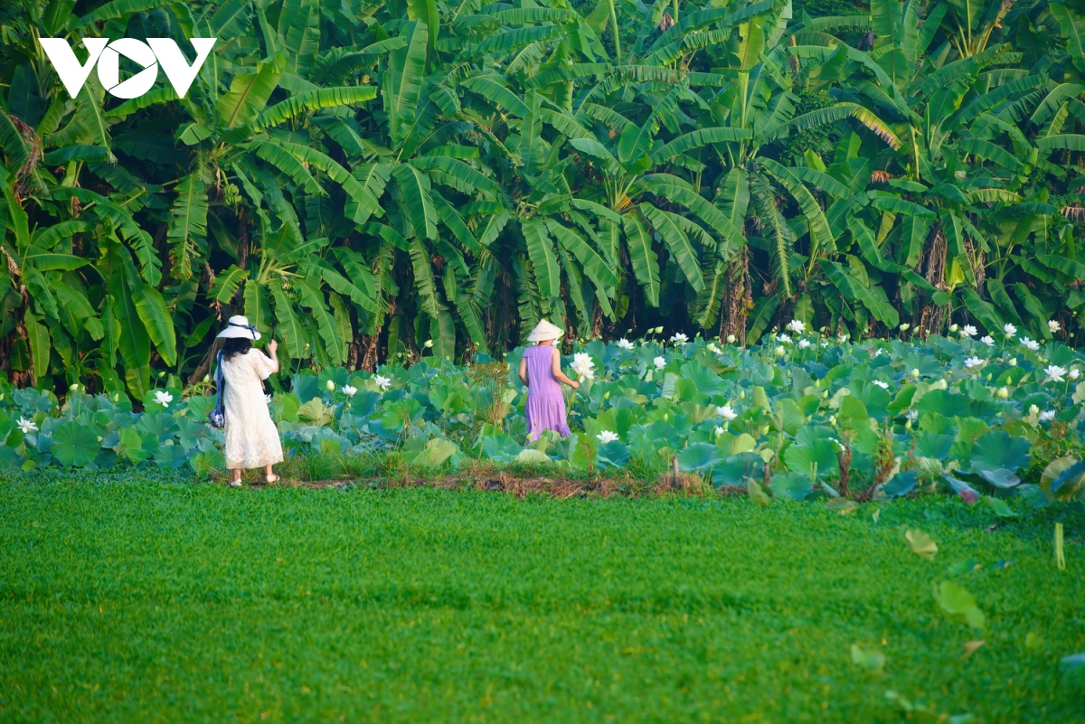 Các bạn trẻ cũng lưu giữ những tấm hình kỷ niệm bên hoa sen trắng tính khiết.