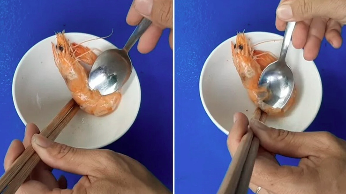 Cuối cùng, banj cố định đuôi tôm bằng muỗng rồi dùng đũa gắp và kéo thịt tôm ra. Cách này cũng tương tự như cách dùng đĩa và muỗng phía trên.