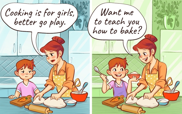 Vào những lúc như thế này, tốt nhất bạn nên tránh đánh giá các hoạt động mà chúng thích thú, và làm mờ ranh giới giữa “chuyện con trai và chuyện con gái”. Mọi người đều có thể cải thiện kỹ năng của mình trong bất kỳ lĩnh vực nào khiến họ hài lòng.