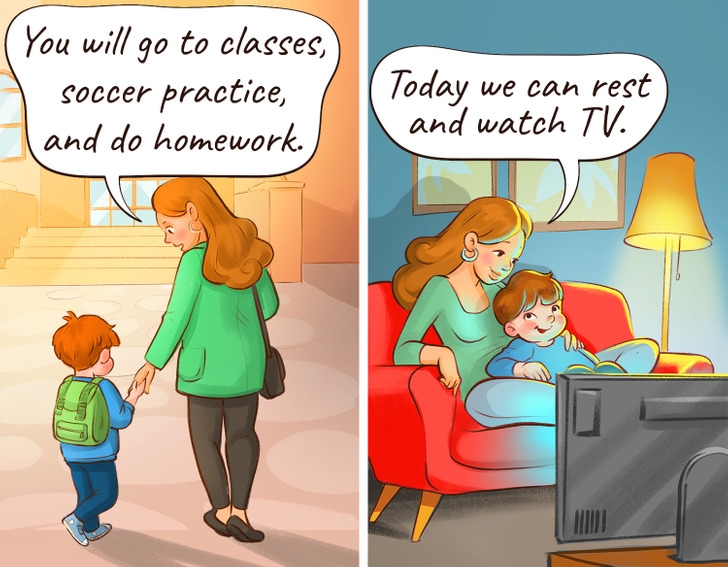 Khi trưởng thành, chúng ta tin rằng một ngày hiệu quả là làm việc không ngừng nghỉ. Nhưng trẻ em cần thời gian rảnh rỗi, vì vậy lựa chọn tốt nhất là không áp đảo trẻ bằng nhiều hoạt động chỉ vì tin rằng trẻ càng làm nhiều việc thì sẽ càng thành công. Khi có quá nhiều hoạt động ngoại khóa, nó thậm chí sẽ gây ảnh hưởng đến cảm xúc của trẻ. Hãy nhớ rằng trẻ em là đối tượng hợp lệ cần có những giây phút nghỉ ngơi.