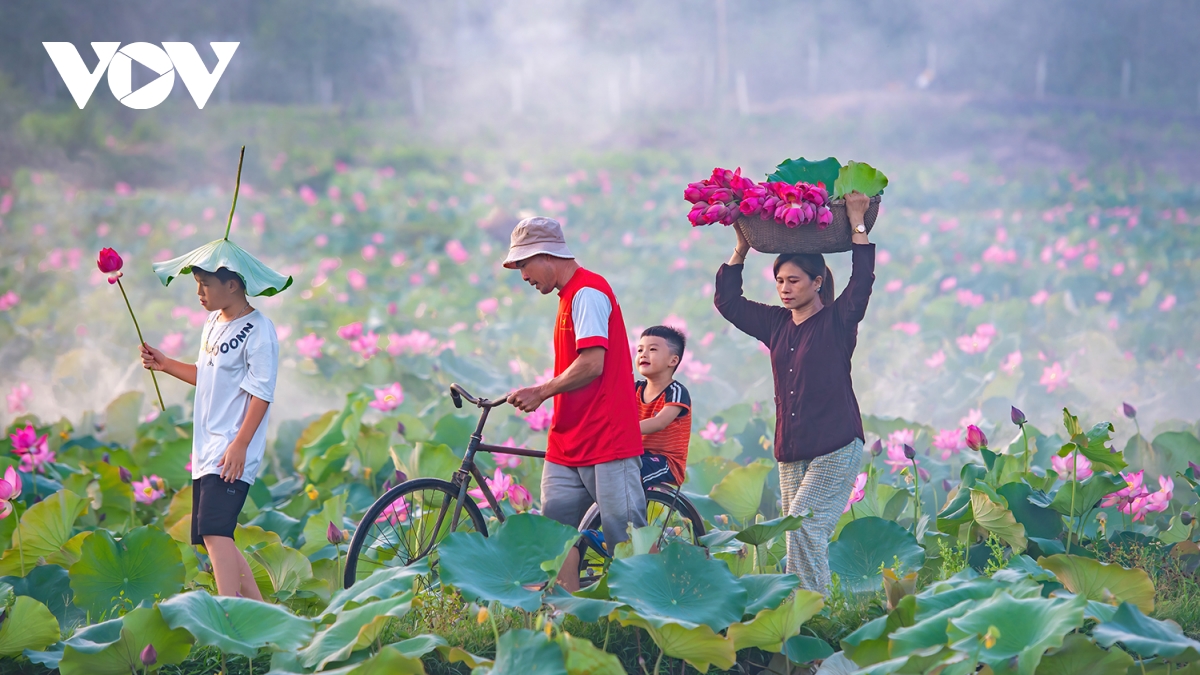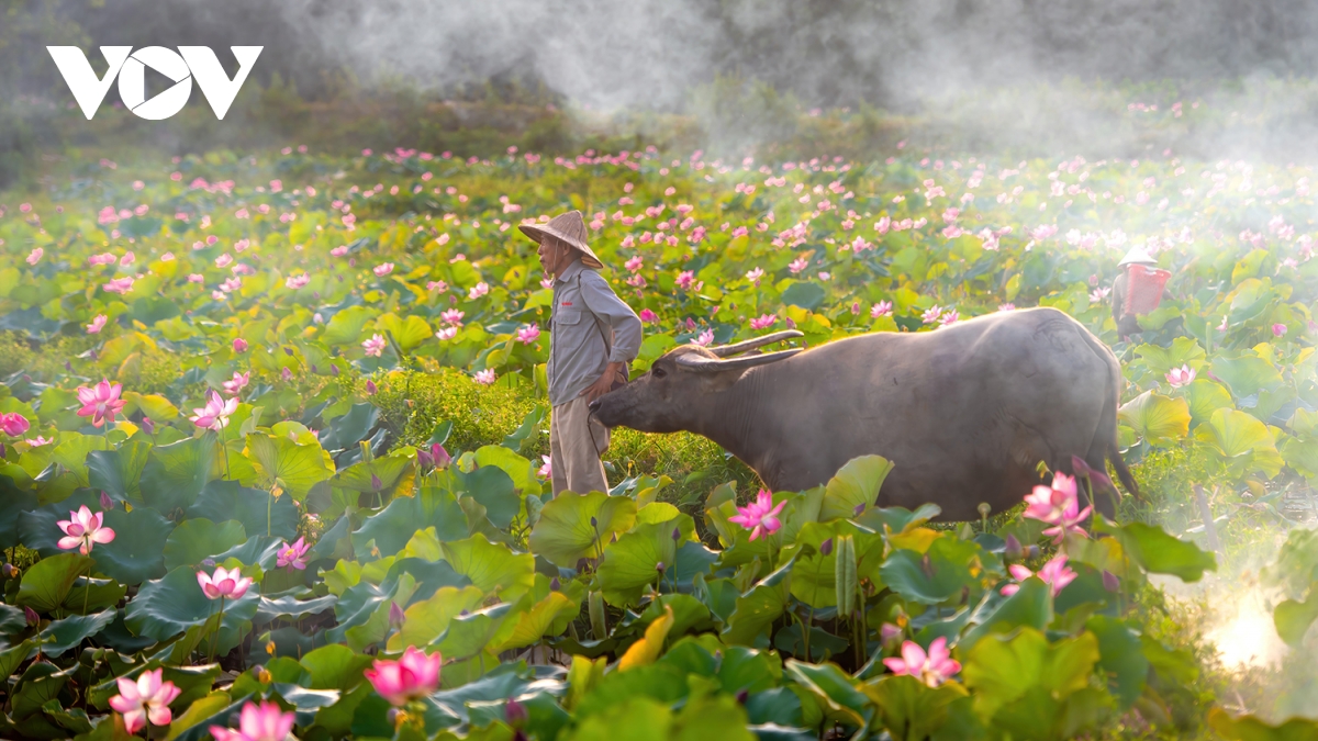 Đầm sen trong nắng sớm hòa với làn sương mờ ảo giữa một vùng quê yên bình tạo nên một bức tranh tuyệt đẹp xao xuyến lòng người.
