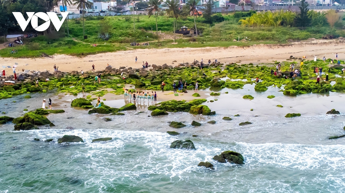 Mùa này, những tảng đá được bao phủ bởi một lớp rêu xanh rờn. Khi thủy triều dần rút, bãi rêu xanh mềm mại phủ kín các tảng đá dần hiện ra tạo nên cảnh đẹp diệu kỳ