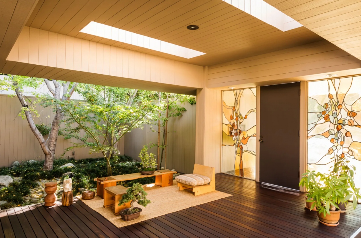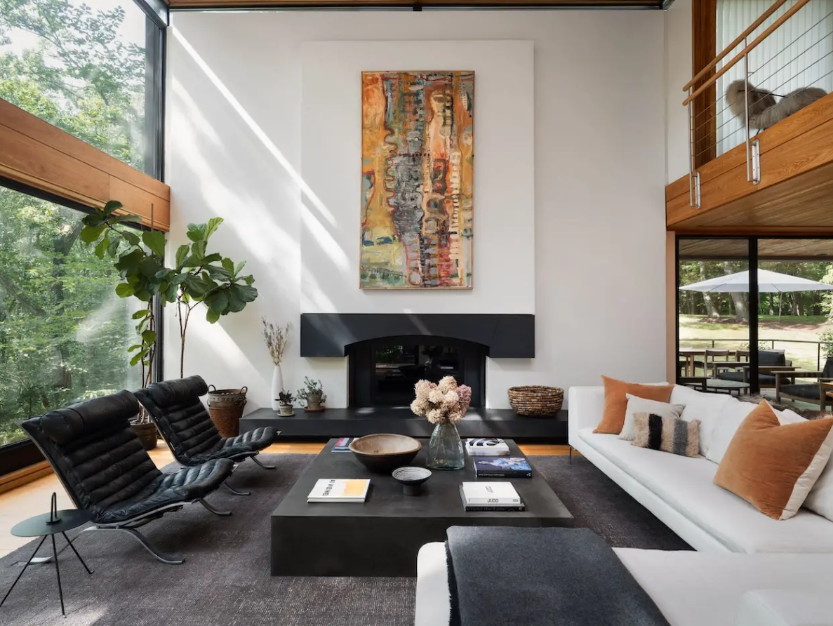 Ngôi nhà là sự pha trộn của nhiều chi tiết hiện đại và tối gian, bao gồm gồm sàn đá, tường gỗ tuyết tùng và dầm gỗ cong.