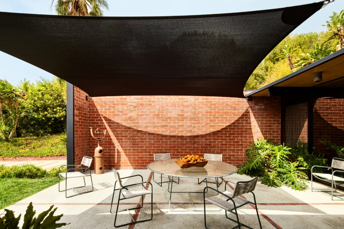 Sân sau rộng rãi, có bàn ăn và khu vực tắm nắng.