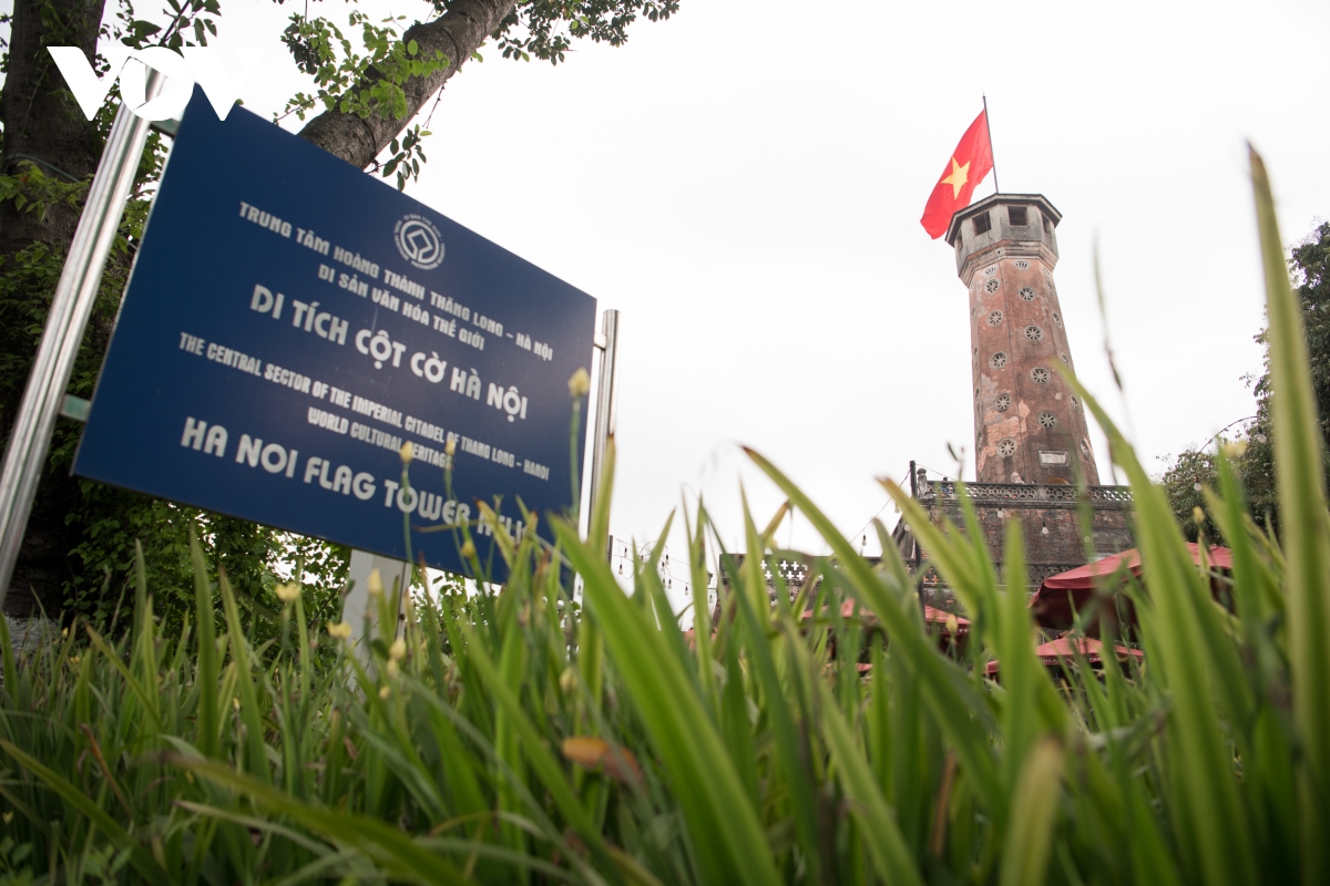 Quốc kỳ tung bay trên Cột cờ Hà Nội như một hình ảnh bất diệt trong ngày thống nhất.