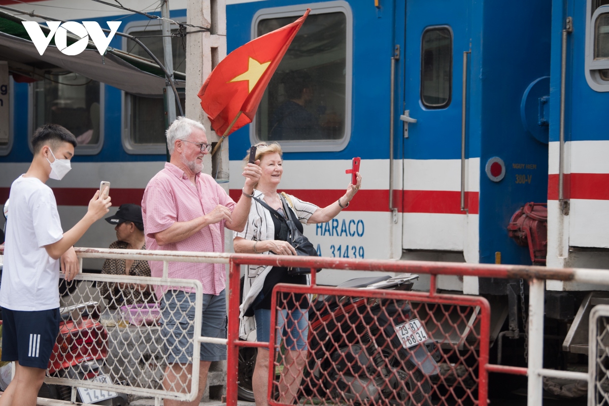 Đôi vợ chồng người nước ngoài thích thú quay lại cảnh đoàn tàu chạy ngang qua