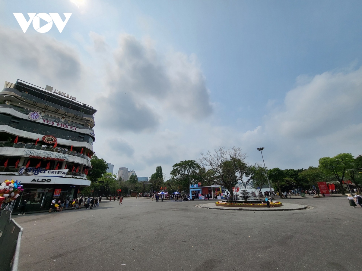 Trong sáng 30/4, thời tiết nắng ráo, mát mẻ, càng về trưa nhiệt độ có tăng cao. Trong ảnh: Khu vực quảng trường Đông Kinh Nghĩa Thục tại phố đi bộ Hồ Gươm.
