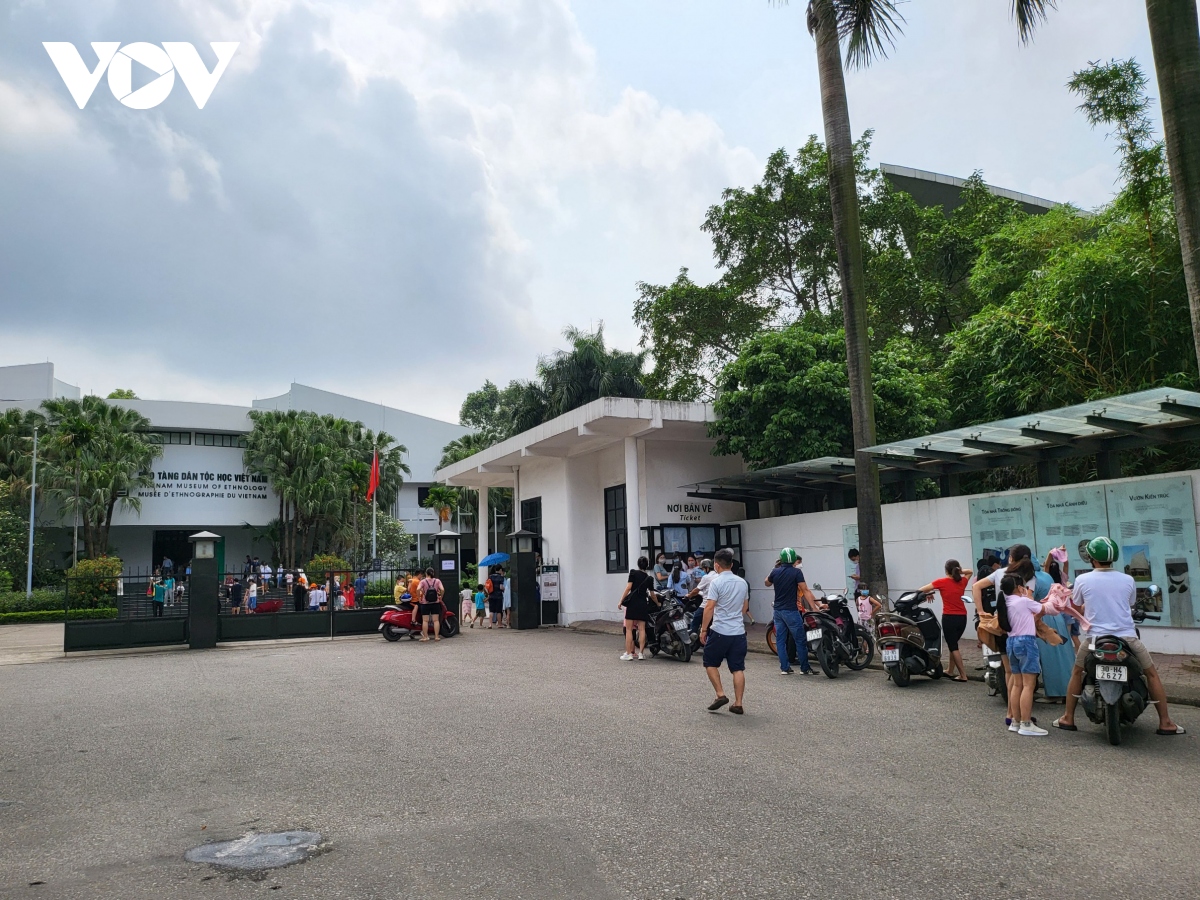 Những ngày này các địa điểm vui chơi công cộng cũng thu hút rất đông người đến. Trong ảnh: Người dân xếp hàng mua vé vào bảo tàng Dân tộc học.