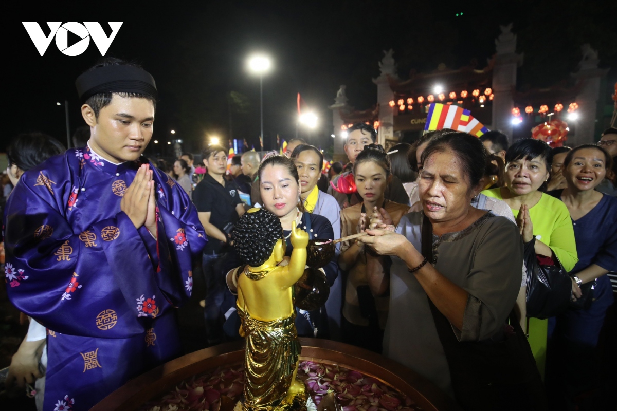 Hàng ngàn phật tử háo hức, lần lượt thực hiện nghi lễ tắm Phật.