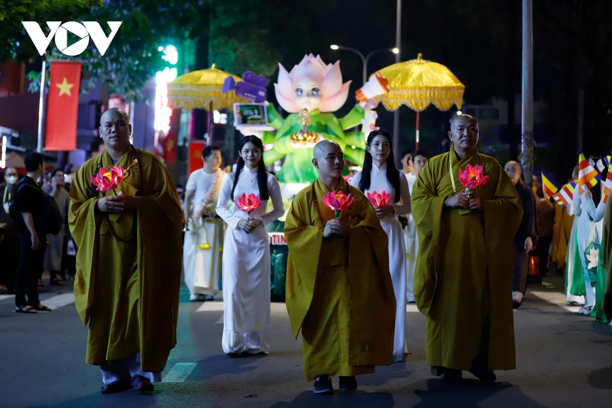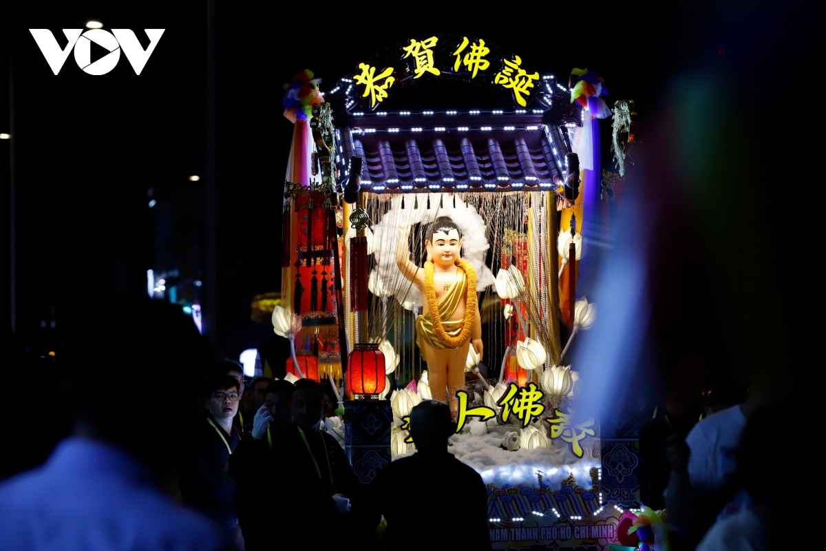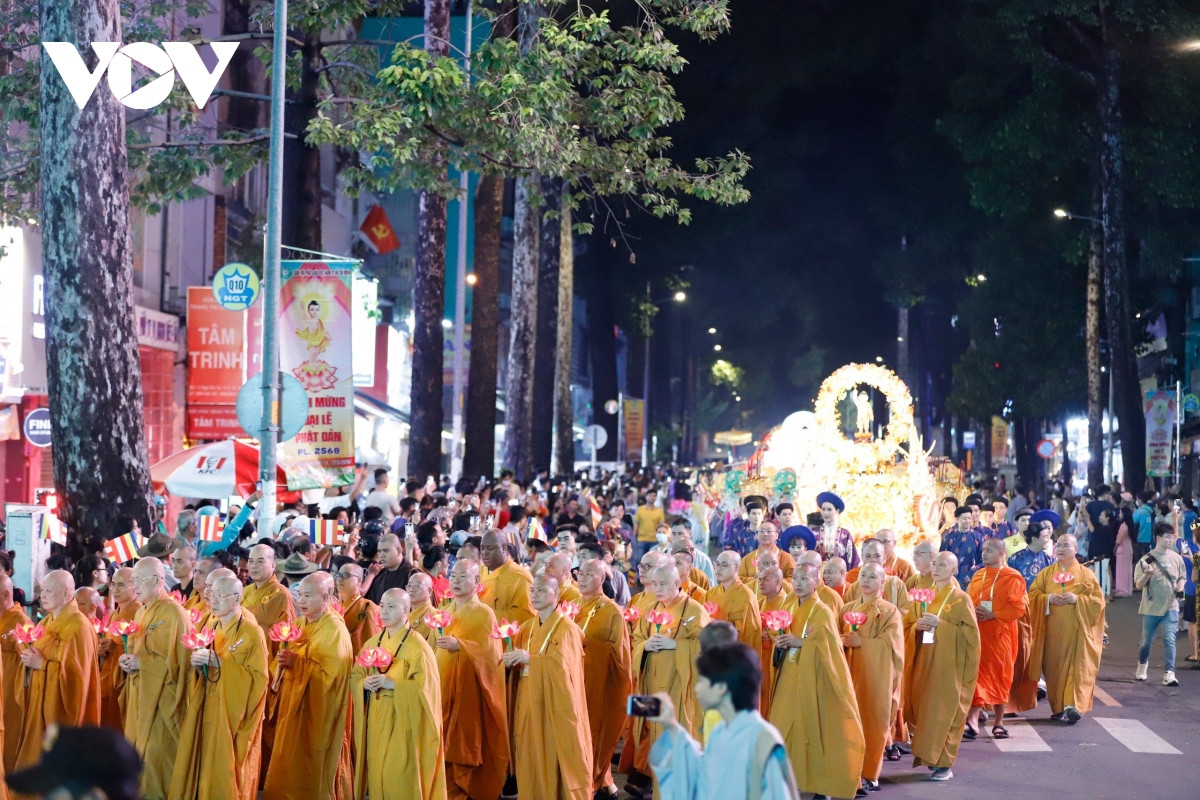 Đoàn rước kiệu Phật đản sinh khởi hành từ tổ đình Ấn Quang diễu hành qua các tuyến đường Sư Vạn Hạnh - Ngô Gia Tự - Lê Hồng Phong - đường 3/2 sau đó tập trung tại Việt Nam Quốc Tự.