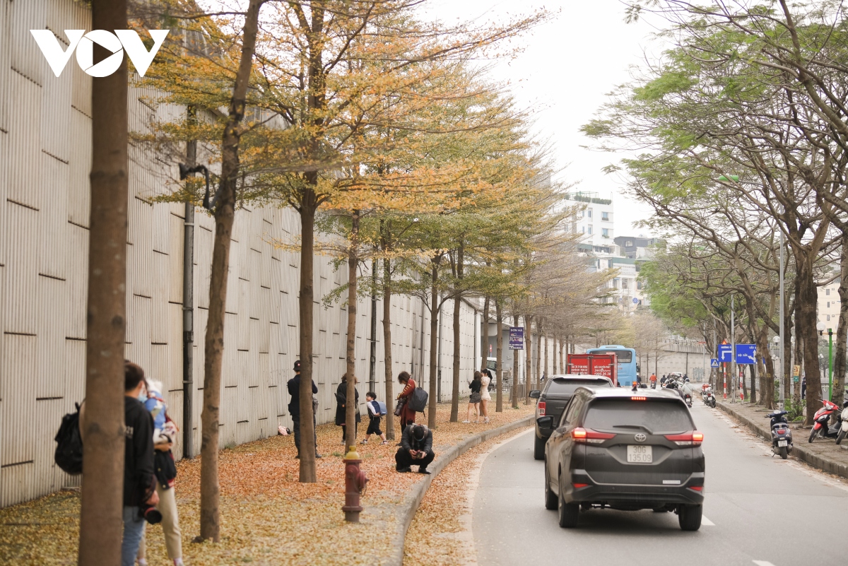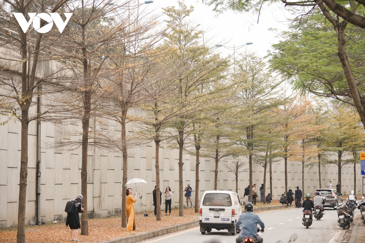 Nhiều bạn trẻ háo hức tìm đến chụp ảnh khi hay tin bàng thay lá, nhuộm vàng cả con đường như mùa thu ở Hàn Quốc giữa lòng Hà Nội.