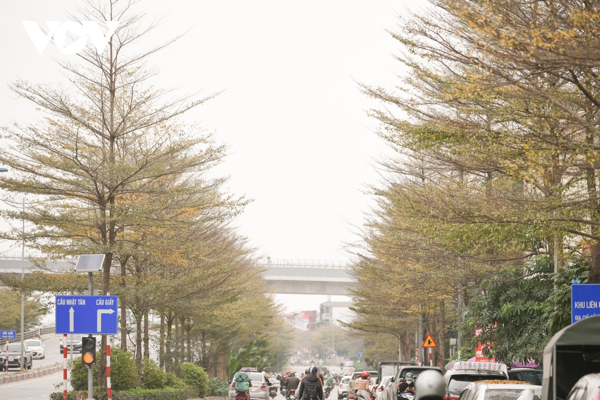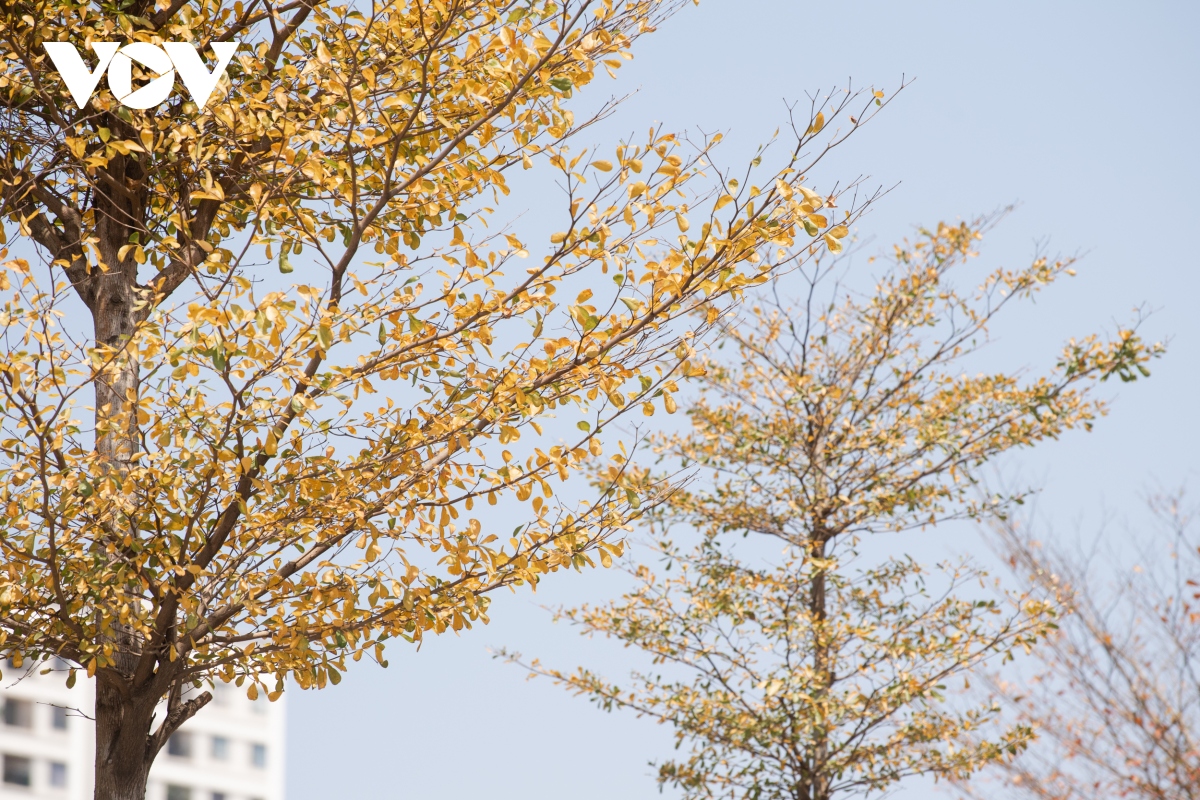 Đặc biệt, tại đoạn đường vành đai hai dưới thấp, sát sông Tô Lịch (đoạn ngã tư Láng, Cầu Giấy) được phủ một màu vàng tươi của bàng lá nhỏ trên vỉa hè.