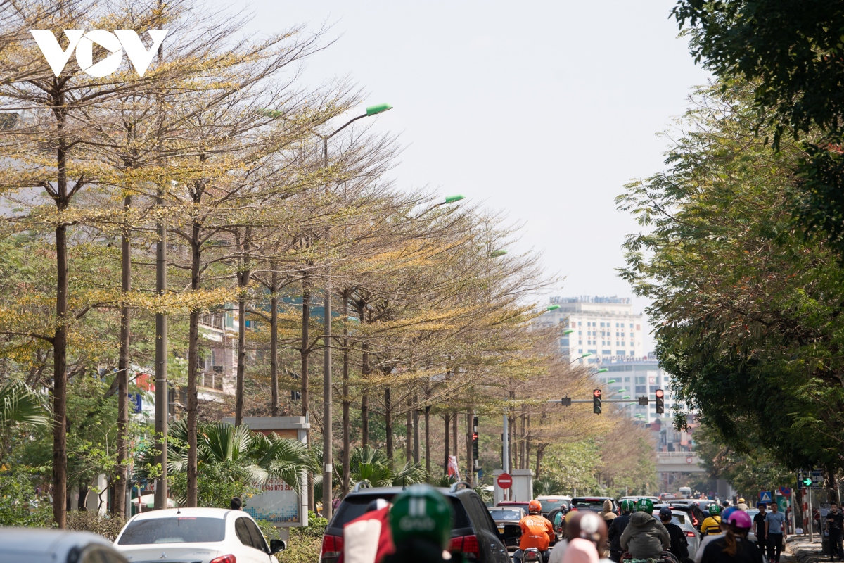 Những ngày đầu tháng 3, trên nhiều tuyến phố thủ đô, hàng cây bàng lá nhỏ bắt đầu chuyển sang sắc vàng và chuẩn bị thay lá.