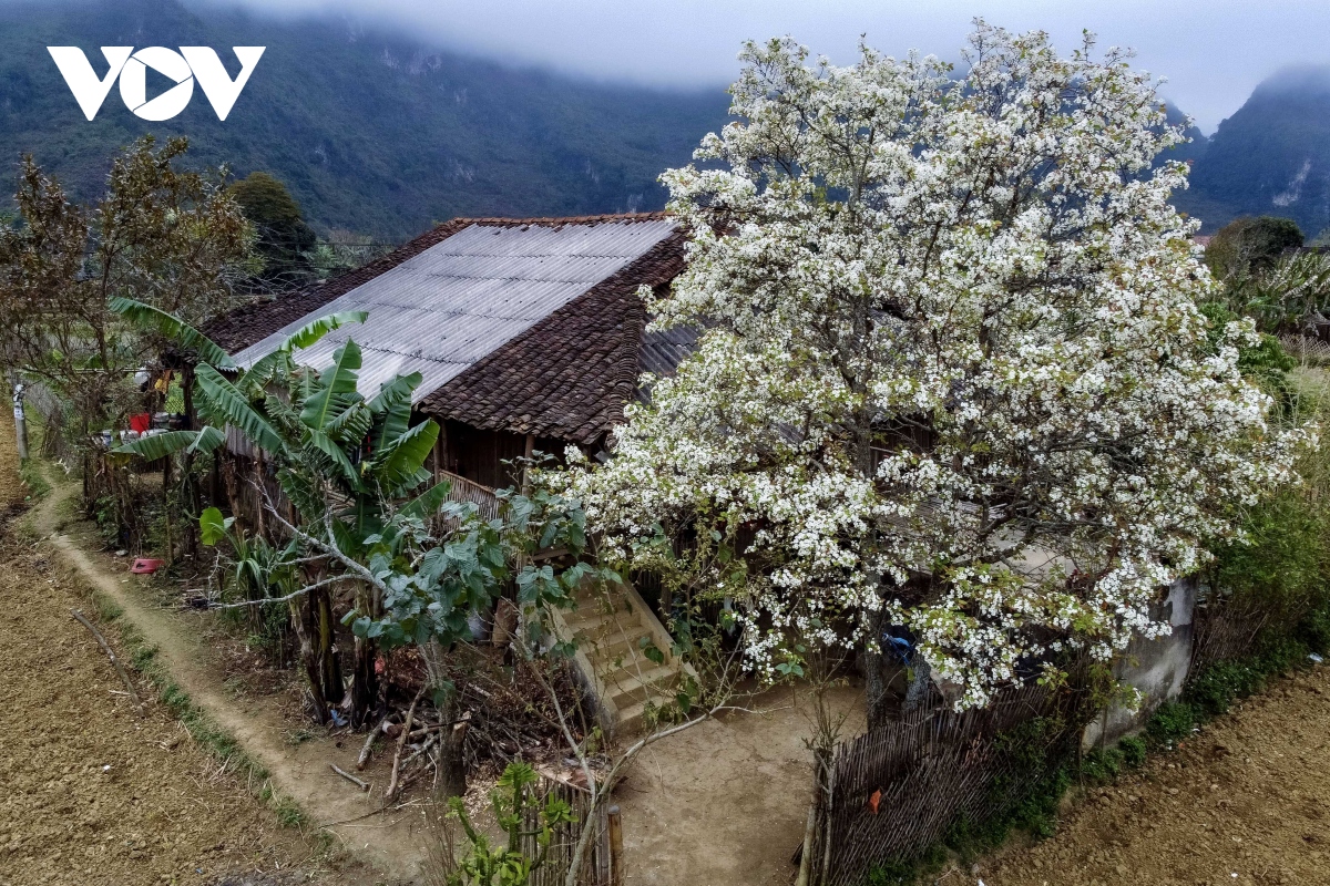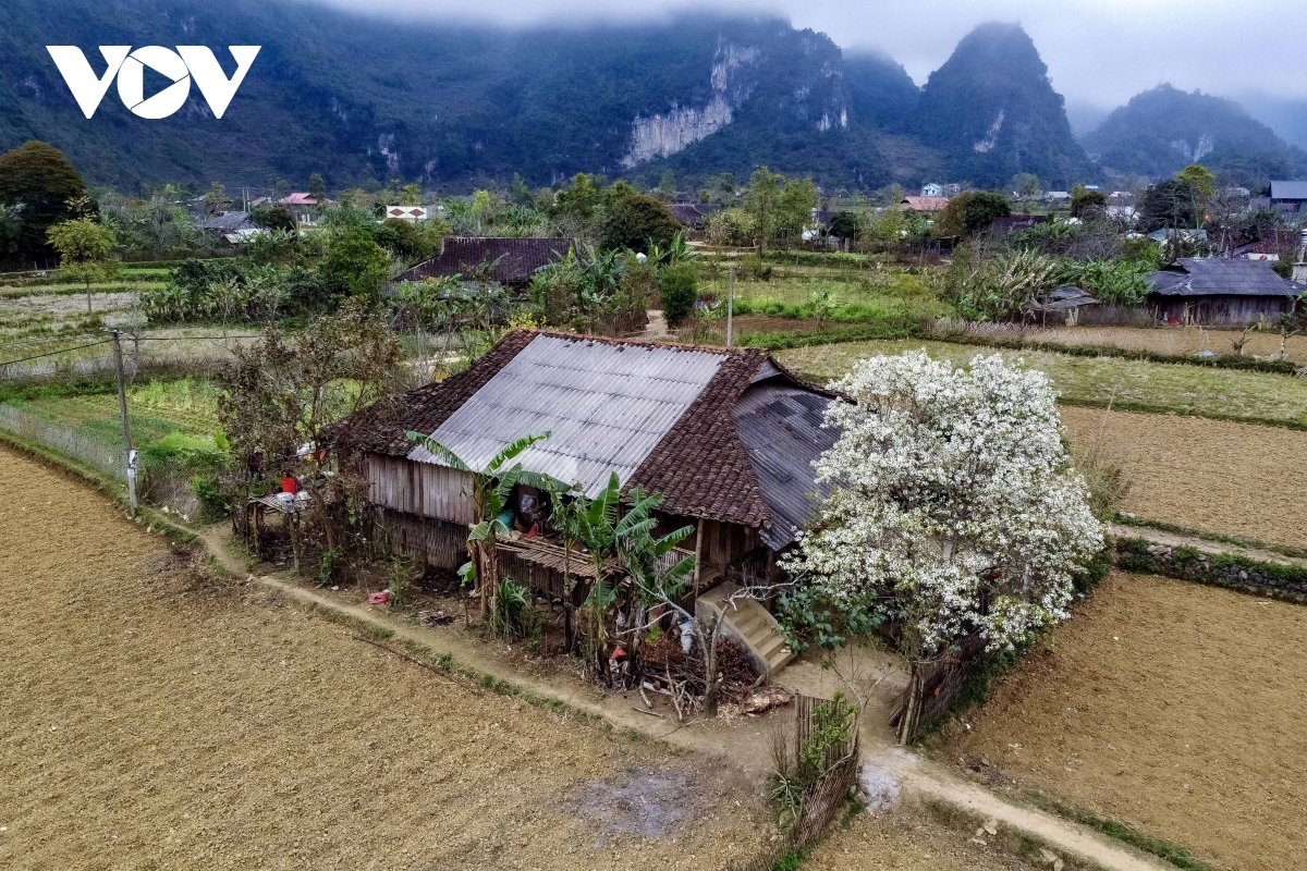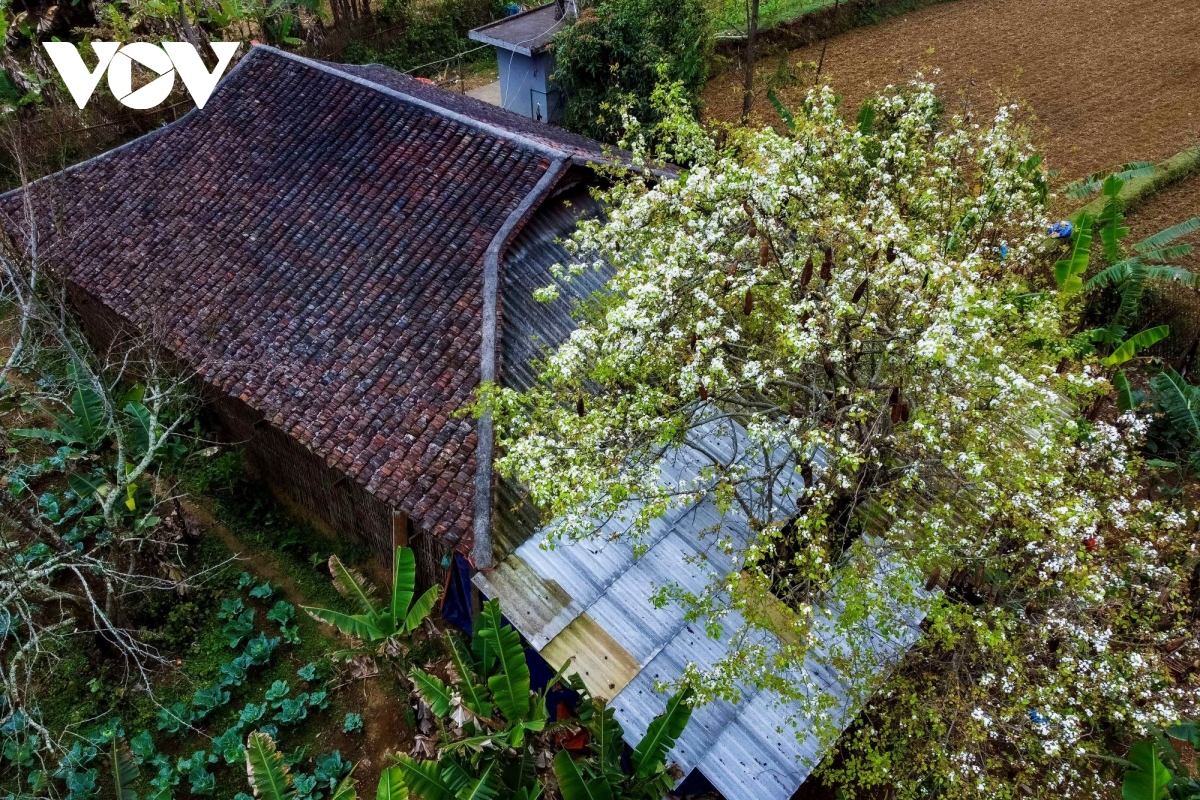 Cây cọt của gia đình bà Lãnh Thị Vá (xóm Bản Chuồng, xã Xuân Trường) có tuổi đời hàng chục năm, tán cây vươn cao, nở hoa trắng muốt như ôm lấy mái nhà sàn lợp ngói âm dương. Bóng cây tô điểm như bức tranh tuyệt sắc của miền non nước Cao Bằng.