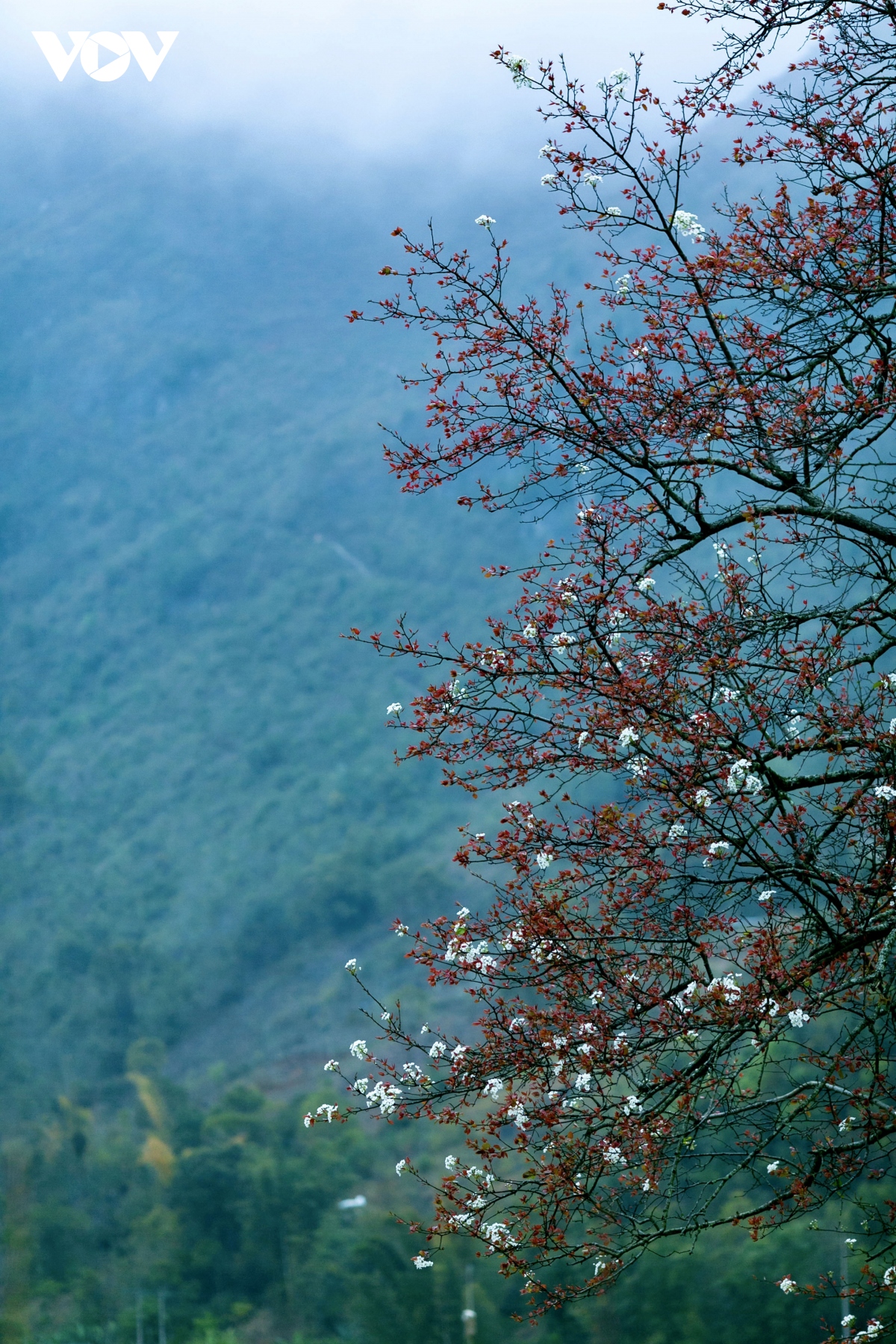 Vào thời điểm này, từng bông mác cọt trắng muốt đan xen với chồi non màu đỏ tạo nên hình ảnh vô cùng độc đáo, báo hiệu mùa lê trổ hoa sắp đến.