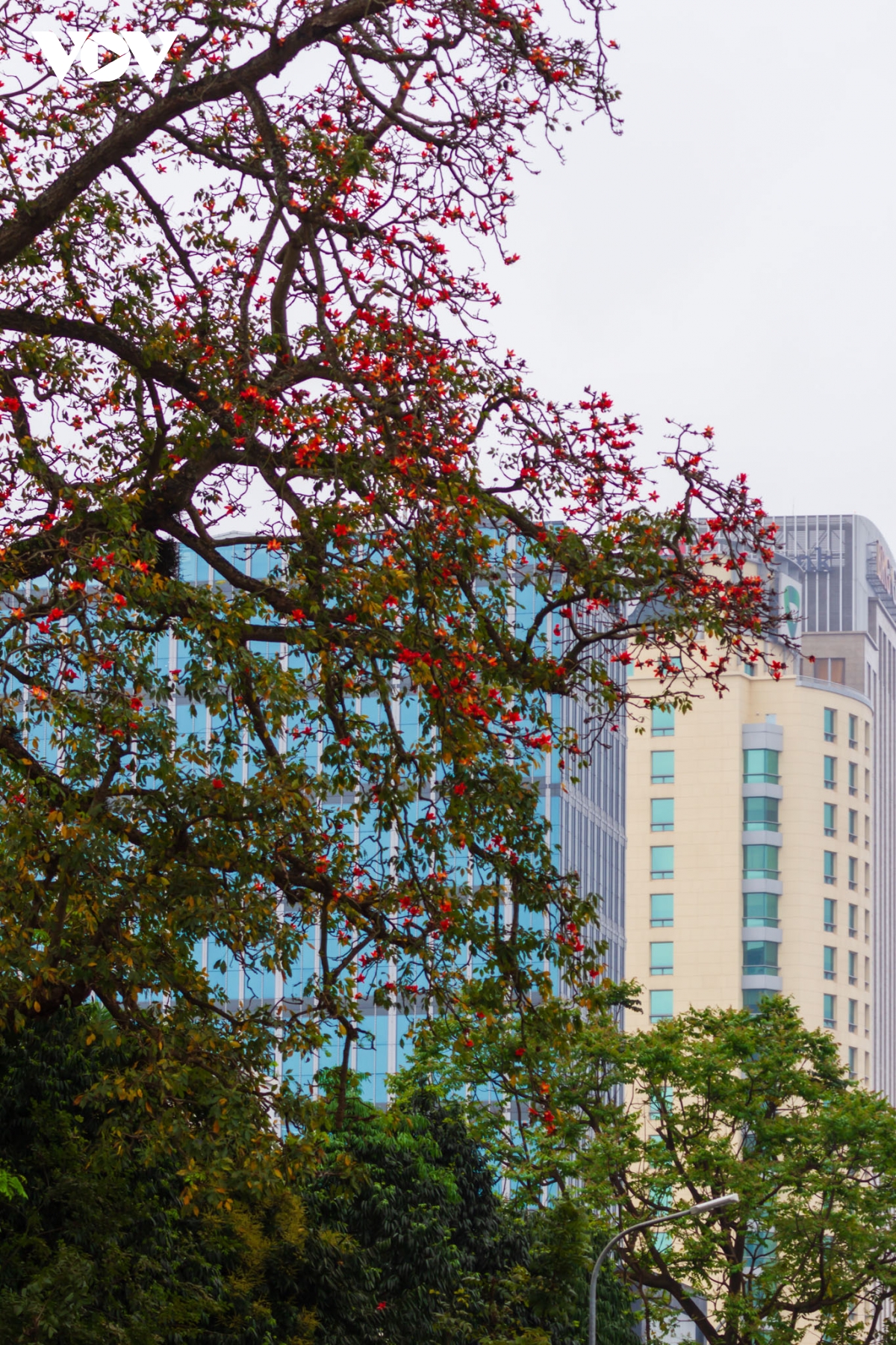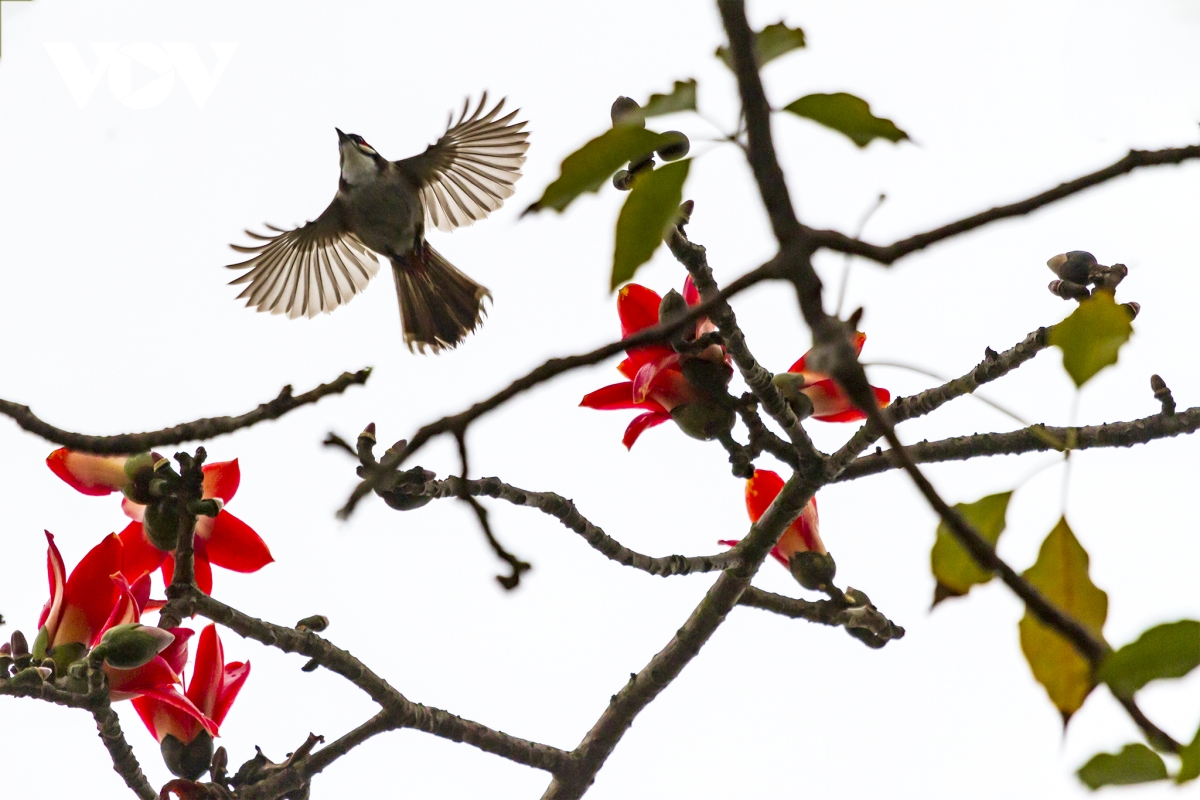 Những bông hoa gạo nở đỏ rực như những đốm lửa nhỏ trên những cành cây