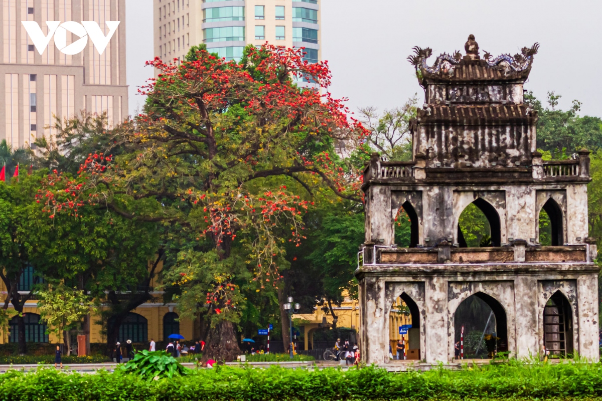 "Ngắm hoa gạo nở rực đỏ bên Hồ Gươm"