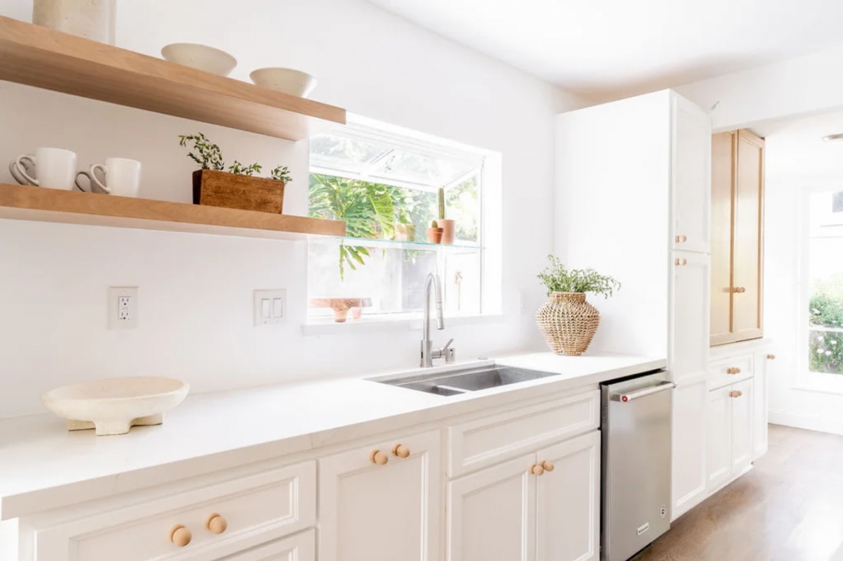 Bếp được bố trị gọn gàng với bàn bếp trắng và đồ gỗ.