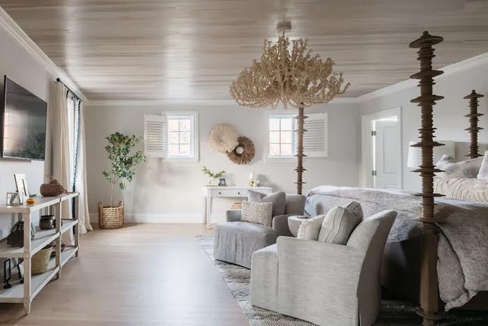 Nếu bạn muốn có một phòng ngủ để bạn cùng vợ hoặc chồng của bạn giao lưu, thì chỗ ngồi rộng rãi là điều cần thiết. Đặt những chiếc ghế có điểm nhấn sao cho chúng quay mặt về phía giường đồng thời tạo một khoảng cách giữa các chiếc ghế và giường. Một điều cần lưu ý là bạn nên chọn màu sắc của những chiếc ghế tương đồng với chiếc giường để tạo ra sự đồng bộ cho căn phòng/.