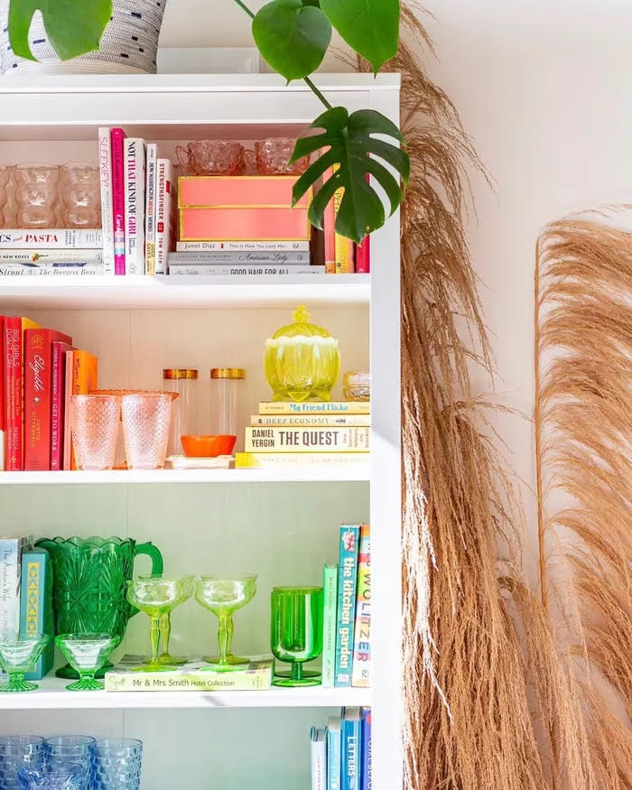 Tạo kiểu cho sách của bạn theo thứ tự cầu vồng là một sự thay đổi thú vị. Đặt sách bên cạnh đồ thủy tinh với màu sắc tương ứng là một cách tuyệt vời để trưng bày hai loại bộ sưu tập cùng một lúc. Nếu bạn muốn thiết lập kiểu trưng bày này trong nhà bếp hơn là trong phòng khách, chỉ cần trao đổi sách nấu ăn thay vì tiểu thuyết.
