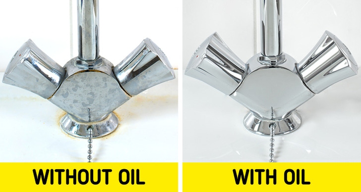 Cho một chút dầu vào một miếng vải và thoa lên đồ đạc, vòi hoa sen, và thậm chí cả bồn cầu của bạn. Bằng cách này, bạn sẽ làm cho chúng sáng đẹp và không bị bám dấu vân tay.