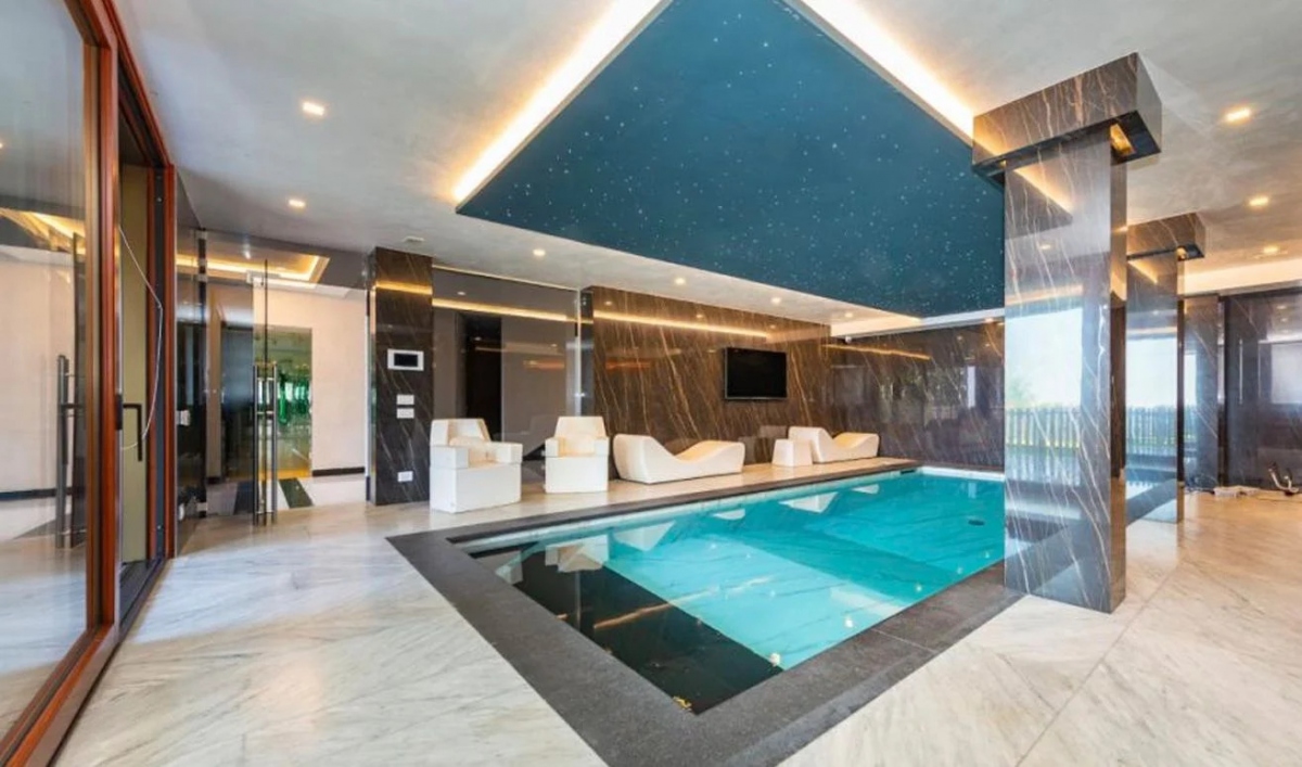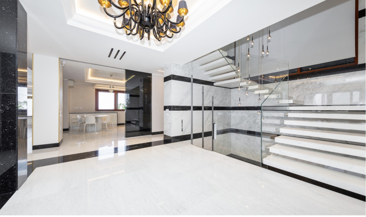 Biệt thự ba tầng được thiết kế sang trọng với nội thất pha trộn giữa các vật liệu đá cẩm thạch khác nhau, đặc biệt các phòng đều có nhiều cửa sổ lớn.