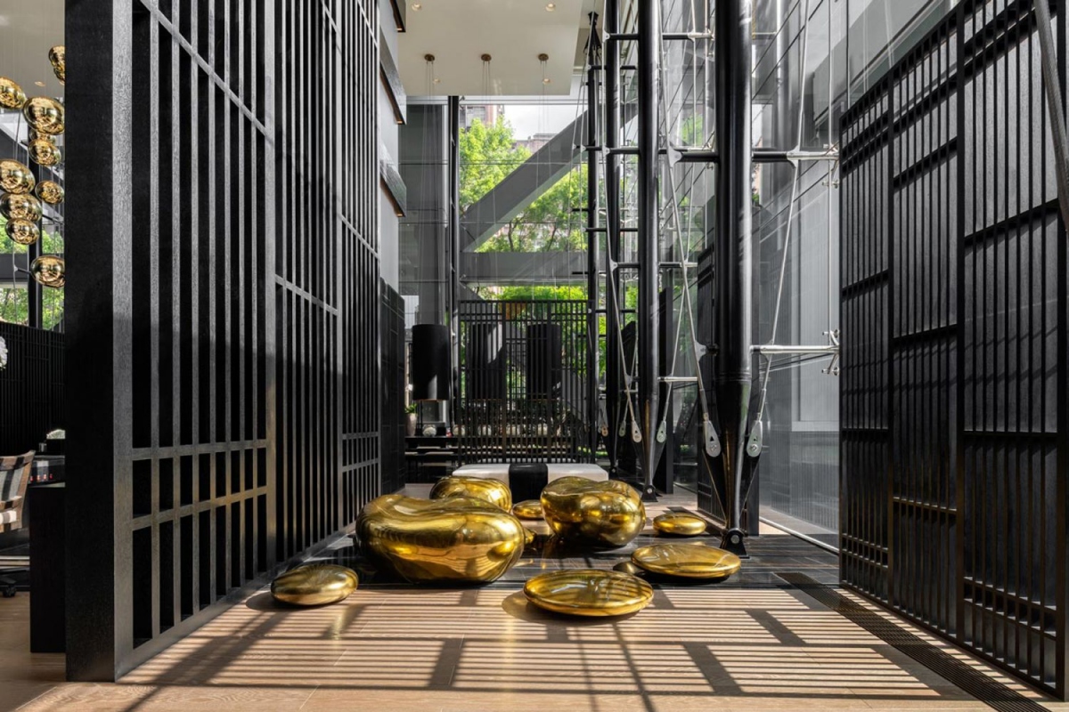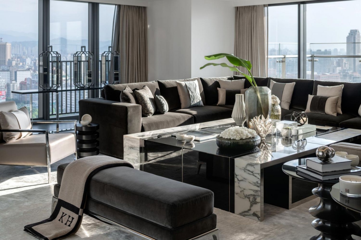 Không gian khu vực sinh hoạt nổi bật với sự kết hợp vật liệu trang nhã giữa gỗ tối màu, đá cẩm thạch và đồng. Kết hợp với ánh sáng xung quanh ấm áp giúp khuếch tán ánh sáng dịu, toàn bộ không gian mang đến một nét quyến rũ tinh tế.