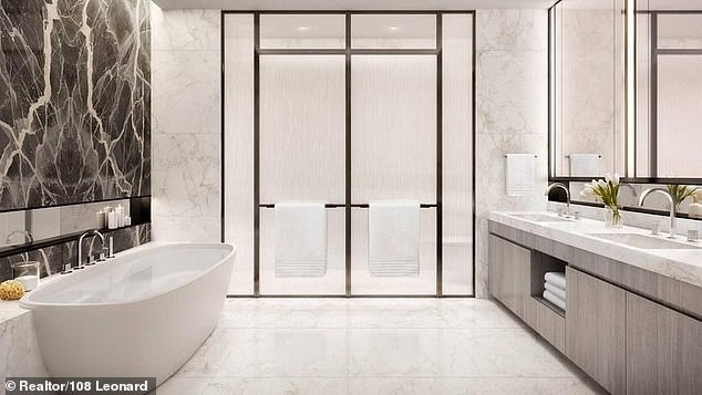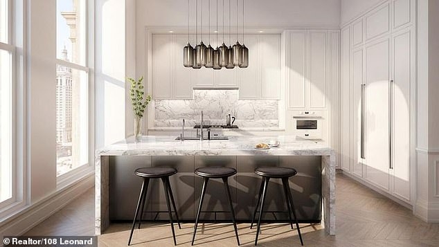 Bên trong căn hộ được thiết kế với không gian mở sang trọng, tinh tế với sàn gỗ sồi chevron. Cửa sổ lớn hình vòm cung cấp tầm nhìn tuyệt đẹp ra quang cảnh thành phố và nhà bếp được thiết kế với tủ Scavolini, mặt bàn bằng đá cẩm thạch và các thiết bị Miele. Phòng tắm có bồn thư giãn và tường được trang trí bằng đá cẩm thạch đen.
