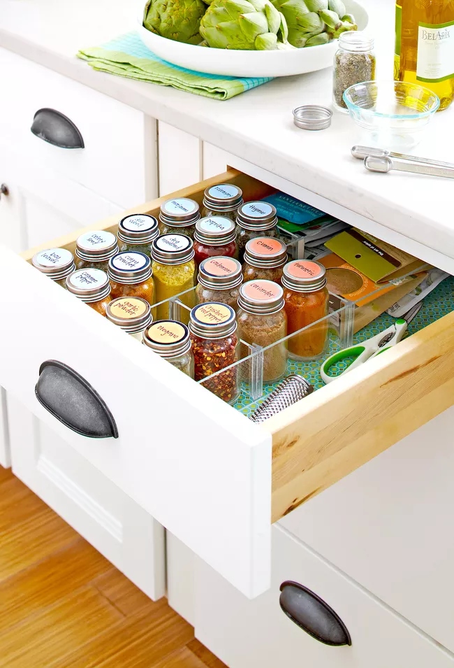 Nhà bếp luôn bừa bộn bởi những khay, lọ gia vị lộn xộn, những chiếc khăn lau tay, tạp dề không được treo đúng chỗ hay những đồ dùng như dao, thớt, kéo,... không được sắp xếp đúng vị trí. Hãy nâng cấp nhà bếp của bạn với những cách lưu trữ vừa gọn gàng, vừa tiết kiệm diện tích. Các chai, lọ nên được đặt trong các hộp lưu trữ hình vuông bên trong ngăn kéo để tránh bị đổ, thêm nhãn dán để dễ phân biệt từng loại. Những đồ gia dụng như dao, kéo thì bạn nên để chúng ở cùng một giá hoặc khung sắt cạnh tủ bếp để dễ dàng kéo ra, kéo vào mỗi khi sử dụng. Trang bị thêm một thanh inox để dễ dàng treo khăn hay tạp dề sau khi dùng.