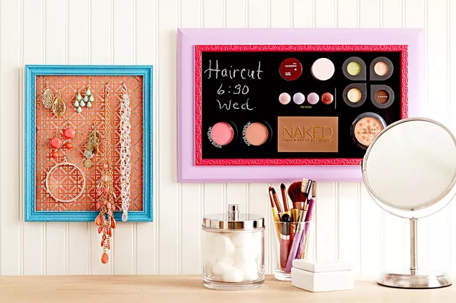 Thông thường, phụ nữ sử dụng khá nhiều đồ mỹ phẩm chăm sóc cho cơ thể, đồng thời cũng có nhiều trang sức, phụ kiện. Để không khiến cho không gian này trở nên lộn xộn và bừa bộn, hãy sử dụng những chiếc hộp được chia ngăn. Bạn có thể dễ dàng xếp son, hộp phấn, hộp kẻ mắt, hay bút kẻ lông mày,... vào đúng vị trí của chúng. Ngoài ra, tận dụng khung vải để cất khuyên tai, vòng tay,... cũng sẽ làm gọn không gian đáng kể./.