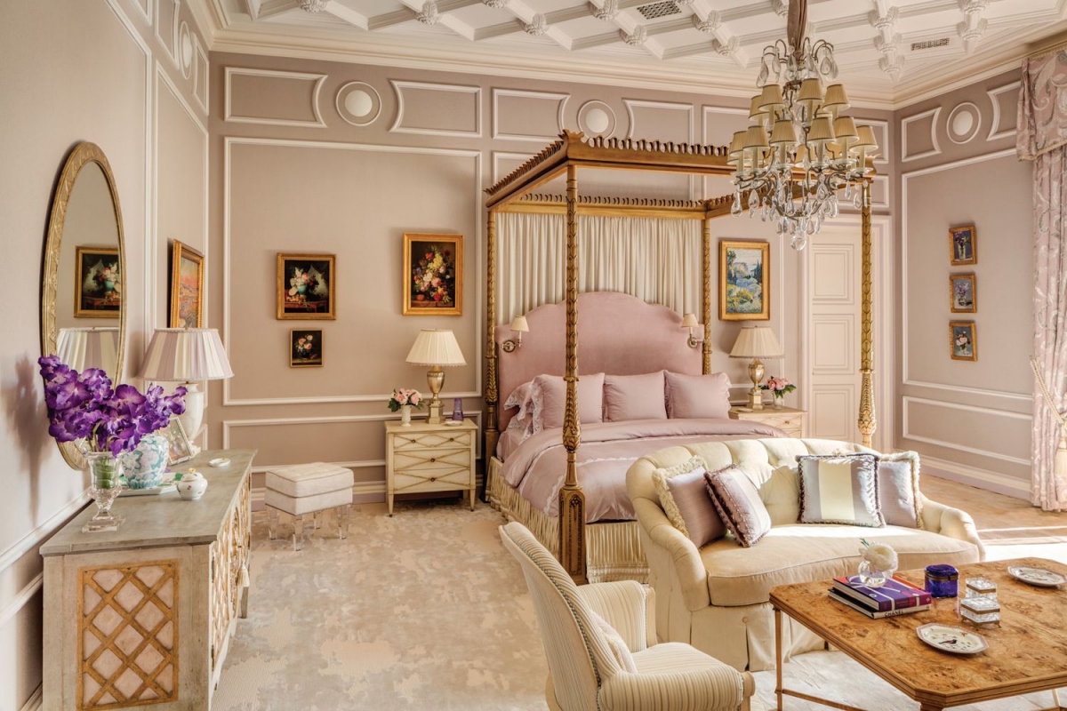 Phòng ngủ có tông màu hồng, trắng chủ đạo, dịu nhẹ. Mặc dù bảng màu đơn giản nhưng phòng ngủ sang trọng này vẫn thanh lịch với thiết kế giường 4 cọc cổ điển và đèn chùm pha lê sang trọng.
