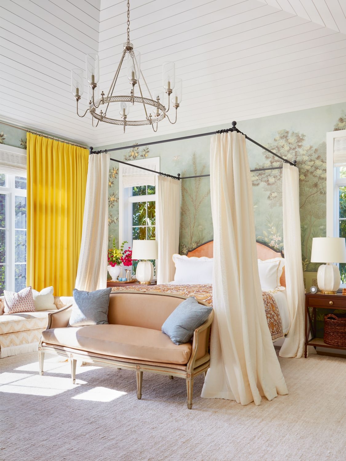 Lấy cảm hứng từ sự hoài cổ đầy màu sắc, Thornton đã trang trí phòng ngủ bằng giấy dán tường màu xanh bạc hà với họa tiết hoa lá. Giường 4 cọc màu hồng đào nữ tính và rèm cửa màu vàng tươi nổi bật giữa không gian. Quan sát kỹ hơn đồ nội thất bằng gỗ độc đáo với các chi tiết chạm khắc họa tiết hoa và dây leo dọc theo bề mặt.