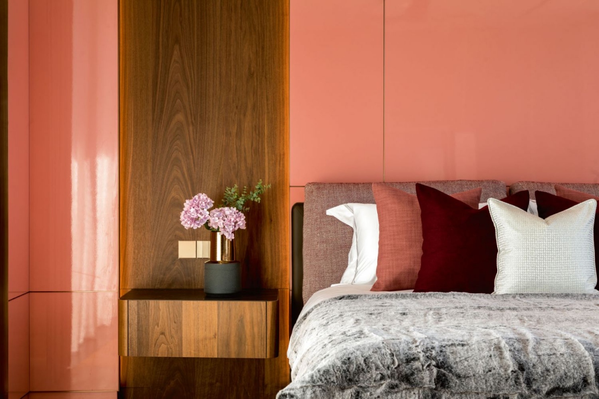 Phòng ngủ có tủ quần áo đặt làm bằng gỗ óc chó, cùng với màu sắc ấm áp. Ngoài ra khu vực tiếp khách cũng nằm trong phòng ngủ chính gây ấn tượng với chiếc ghế dài màu cá hồi và một chiếc TV xoay đặt làm riêng.