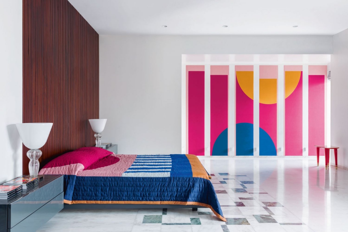 Màu sắc đậm là một dấu ấn trong tác phẩm của Jannat Vasi - một nhà thiết kế có trụ sở tại Mumbai. Vasi đã đưa phong cách phổ biến của mình vào việc thiết kế phòng ngủ chính này một cách hiệu quả.
