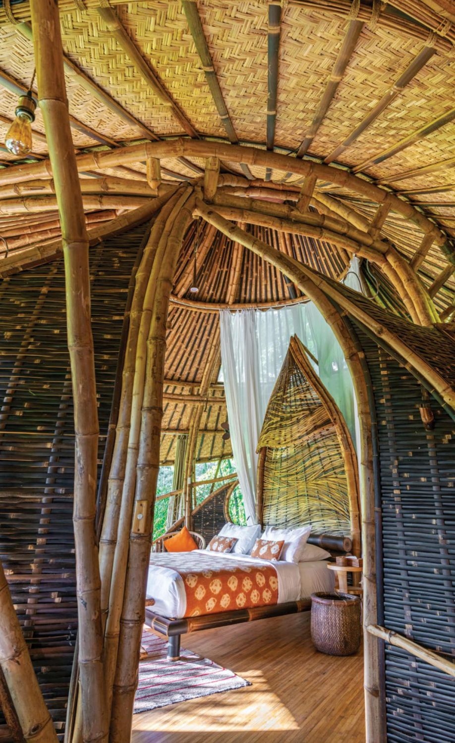 Ngôi nhà kiểu Bali này rất phù hợp với phong cách sống của chủ nhân. Thuộc sở hữu của gia đình Hardy, nơi này được làm từ tre.Bản thân phòng ngủ có những tán cỏ cứng cáp đáng kinh ngạc và mở tầm nhìn ấn tượng ra quang cảnh thiên nhiên ở Ubud.