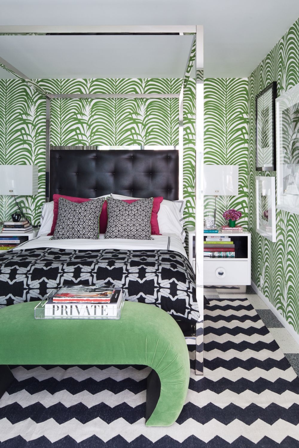 Martyn Lawrence Bullard là nhà thiết kế cho các ngôi sao đã giám tuyển và tạo kiểu cho ngôi nhà Palm Springs của riêng mình. Phòng ngủ màu xanh lá cây thú vị của anh ấy là sự thể hiện cá tính sôi động của anh ấy — với đầu giường bọc da, sàn hoa văn, đệm nhung xanh lá cây và giấy dán tường màu xanh lá cây hoa.