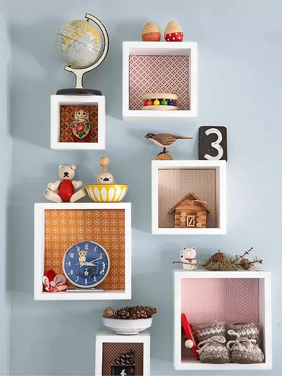 Trưng bày những món đồ sưu tầm, đồ trang sức và những đồ vật nhỏ như đôi giày đầu tiên của con là một cách dễ dàng để trang trí không gian phòng ngủ cho trẻ. Xây dựng theo trật tự hoặc bố cục không đối xứng tùy thích cho một diện mạo tuyệt đẹp với giá treo tường, khung ảnh làm sẵn hoặc những chiếc hộp cán bóng.