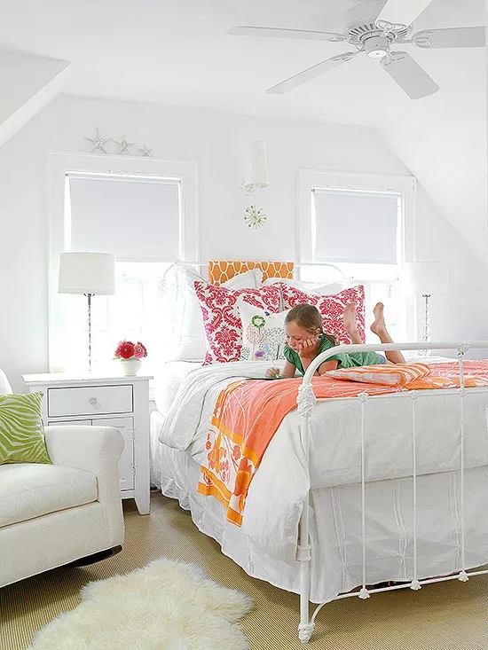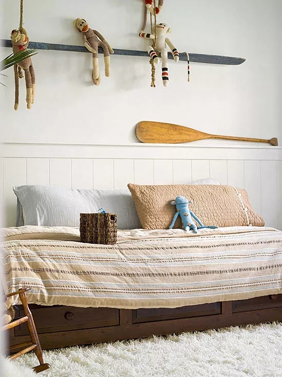 Hãy giúp cho con có cảm giác như một vùng biển ven biển ngay trong phòng của mình. Đồ đạc, đồ gỗ và tường màu trắng, sạch sẽ giúp tăng ánh nắng mặt trời, khiến căn phòng trở nên nhẹ nhàng và tươi sáng. Một tấm thảm làm từ sợi tự nhiên, sẽ tạo cảm giác như cát dưới chân. Chọn một vài phụ kiện liên quan tới biển, chẳng hạn như khăn trải giường có hoa văn Hawaii hoặc bộ sưu tập vỏ sò.