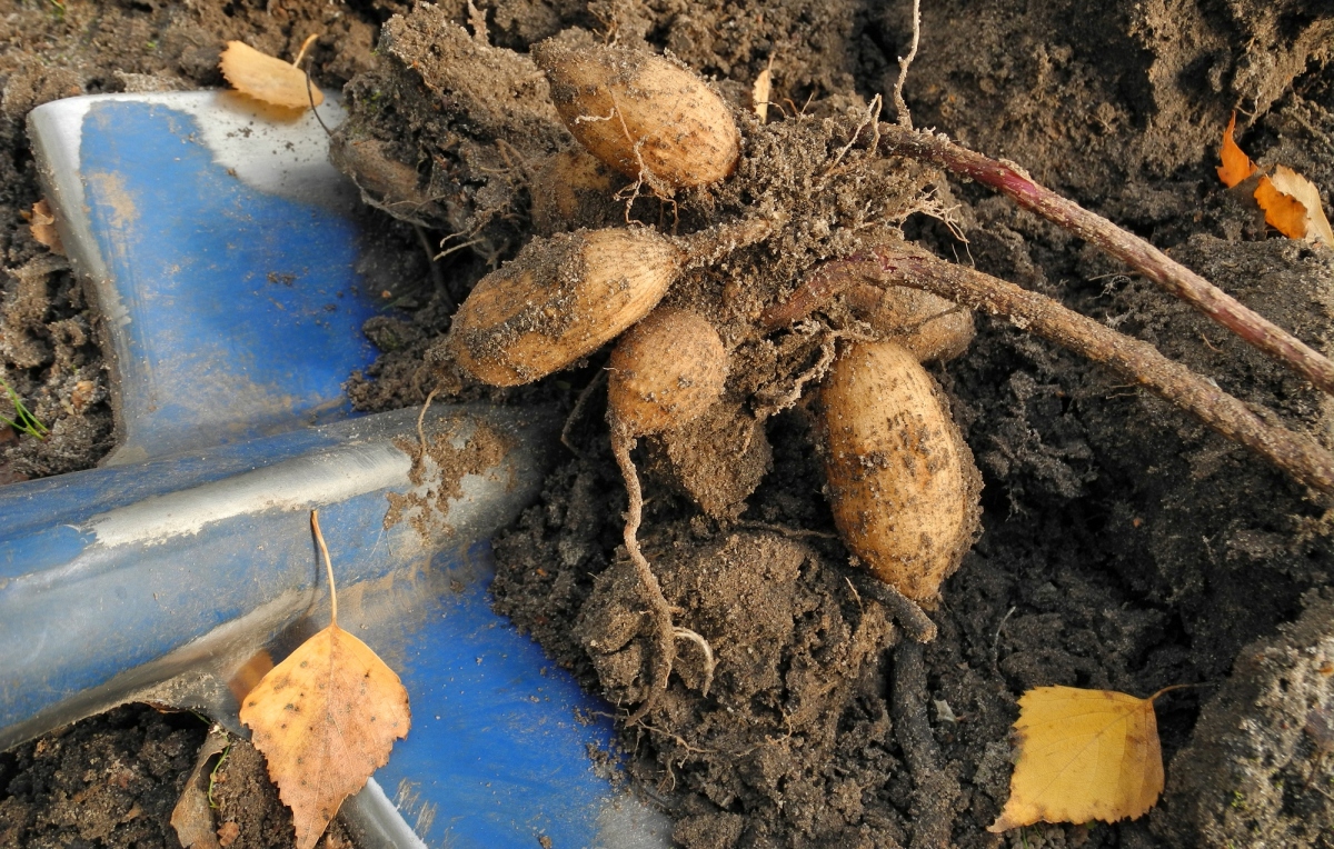 Hãy chờ cho đến khi lá cây chuyển sang màu nâu sau khi có sương giá, sau đó nhẹ nhàng đào lấy củ hoặc củ. Cắt bỏ lá và phủi càng nhiều đất càng tốt. Tránh rửa bằng nước vì hơi ẩm có thể làm thối chúng trong quá trình bảo quản. Cách tốt nhất là để khô ở nơi thoáng mát trong khoảng một tuần. Sau đó, đóng gói trong một hộp đựng thoáng khí, chẳng hạn như hộp các tông.