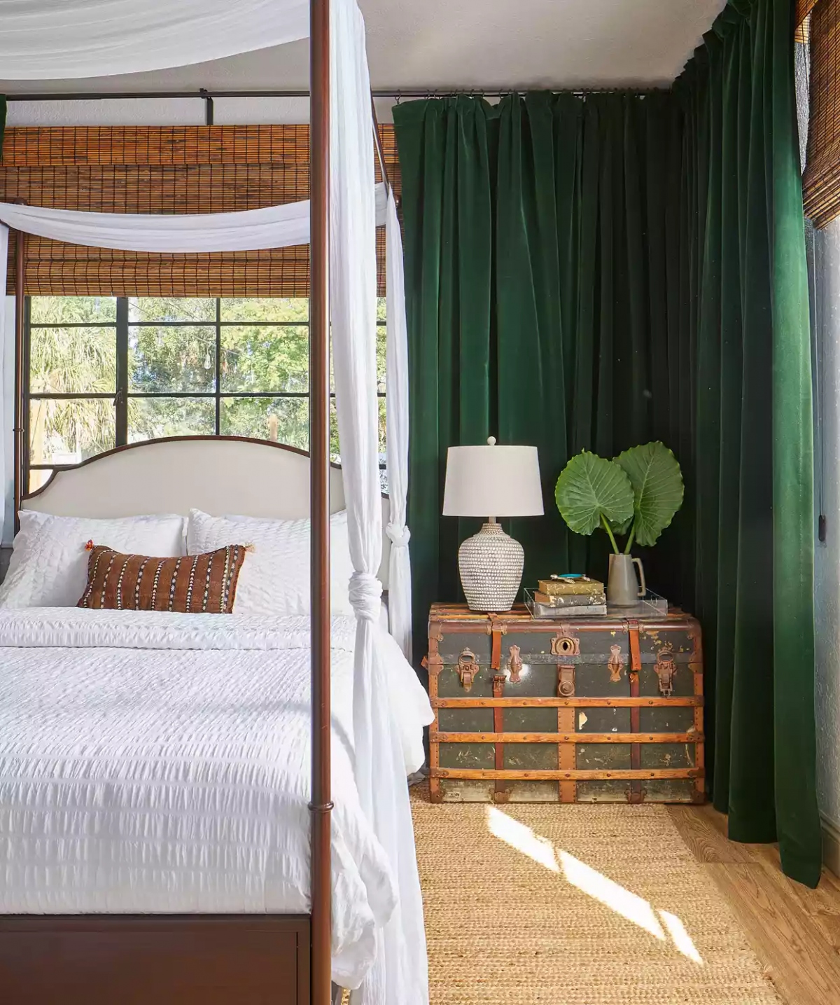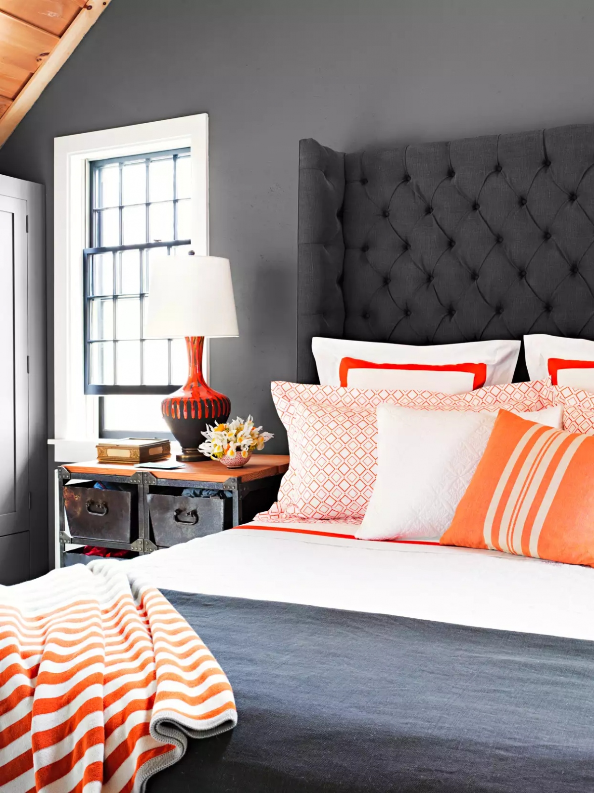 Sử dụng vải có màu tối hoặc tương phản với màu sơn tường giúp tạo cho căn phòng có cảm giác cao cấp và sang trọng hơn, cho dù đó là ga giường, rèm cửa hay thảm trải sàn thì bạn cũng chỉ cần có sự lựa chọn phù hợp và sắp xếp hợp lý. Những tấm thảm bằng vải và rèm có thể giống như một tác phẩm nghệ thuật khi được làm nổi bật trên sàn tối màu, chẳng hạn như gỗ cứng sẫm màu hoặc xi măng xám. Ngoài ra, việc lắp đặt cửa sổ cũng có thể tạo thêm sự tinh tế cho cả nội thất bên trong và sự hấp dẫn khi nhìn từ bên ngoài.