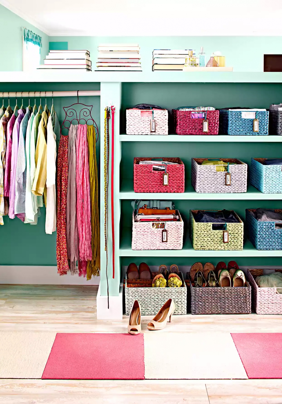 Việc xếp các món đồ ít sử dụng vào giỏ đựng đồ có thể là cách nhanh chóng giúp bạn dọn dẹp không gian phòng ngủ. Để tạo ra sự đồng nhất, hãy lựa chọn những chiếc giỏ hoặc những chiếc hộp có nắp xinh xắn, cùng chất liệu và hình dạng. Chúng sẽ góp phần làm gọn gàng và cũng là cách trang trí bề mặt tủ, trong khi không gian vẫn ngăn nắp. Cách làm này sẽ giúp giảm bớt sự lộn xộn mỗi khi nhìn vào.