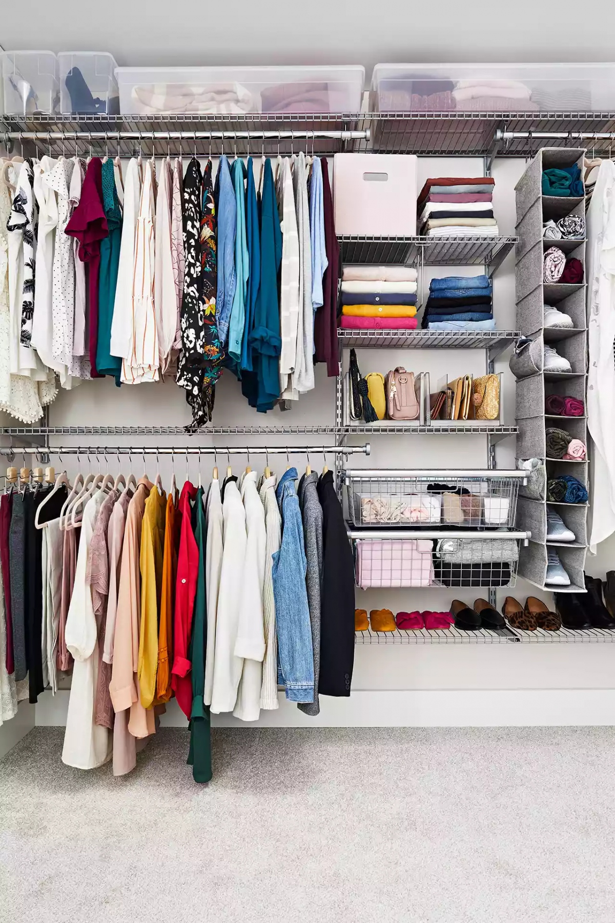 Tủ quần áo thường là nơi có xu hướng được lấp đầy nhiều nhất trong phòng ngủ. Vì thế sẽ không tránh khỏi việc chúng trở nên đầy ắp và lộn xộn. Để cải thiện được điều này, ít nhất mỗi lần giao mùa, bạn hãy đổ hết mọi thứ ra khỏi tủ quần áo và lau sạch bên trong bằng khăn lau bụi, sau đó sắp xếp và phân chia không gian lưu trữ theo chức năng riêng biệt. Phương pháp này sẽ giúp bạn có thể dễ dàng tìm ra những món đồ mình cần mà không cần lục tung cả tủ quần áo.